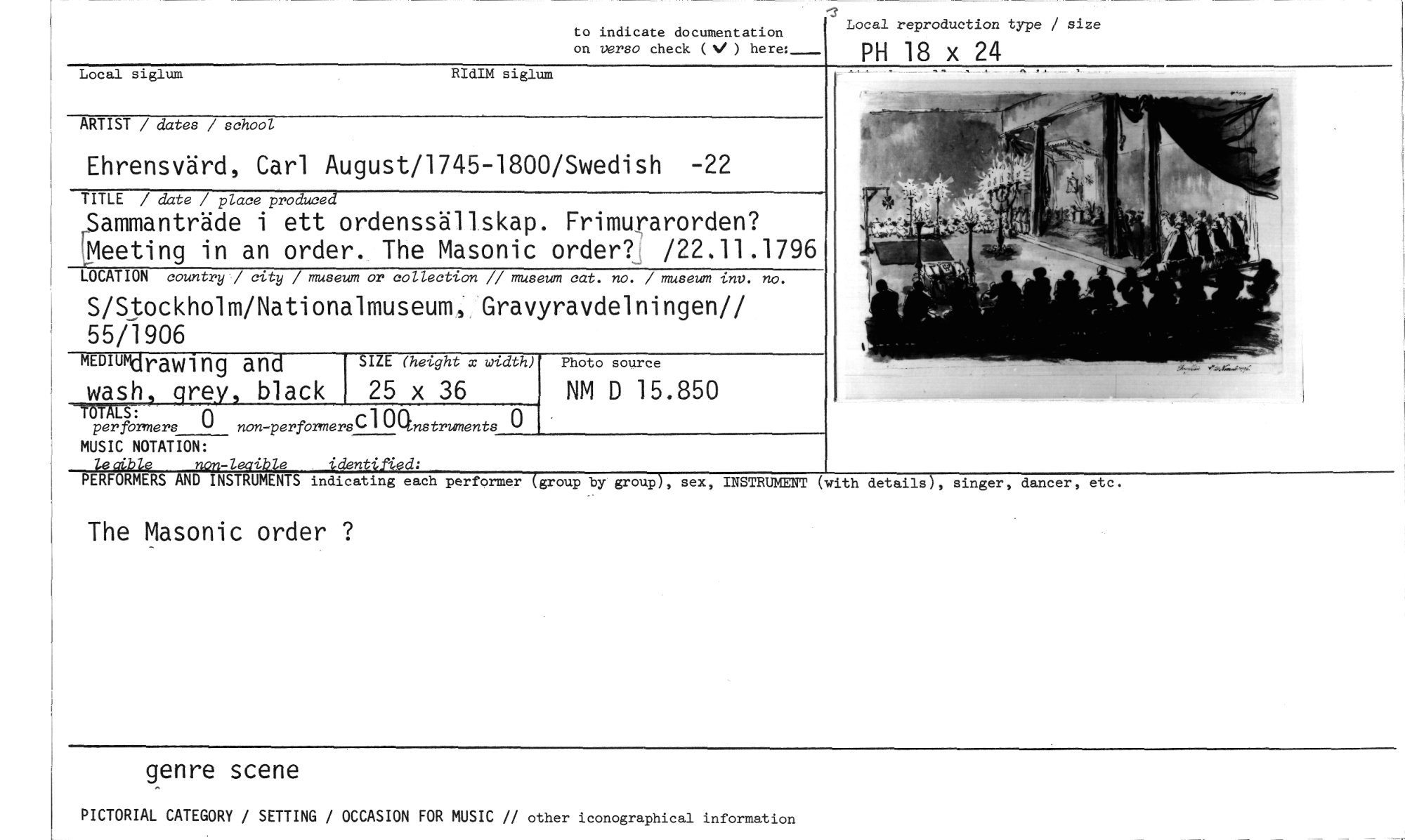//// to indicate documentation //// Local reproduction type / size //// on verso check (V ) here:_ PH 18 x 24 //// Local siglum RIdIM siglum //// ARTIST / dates / school //// Ehrensvärd, Carl August/1745-1800/Swedish -22 //// TITLE / date / place produced //// „Sammanträde i ett ordenssällskap. Frimurarorden? Seeting in an order. The Masonic order? /22,11.1796 //// LOCATION country / city / museum or collection // museum cat. no. / museum inv. no. //// S/Stockholm/Nationalmuseum, Gravyravdelningen// 55/1906 //// Kmumdrawi ng and SIZE (height x width) //// wash, cirey, black 25 x 36 //// -TOTALS: //// per formers 0 non-performersC 10Qnstruments 0 //// Photo source //// NM D 15.850 //// MUSIC NOTATION: //// non-leaible identified: //// PERFORMERS AND INSTRUMENTS //// indicating each performer (group by group), sex, INSTRUMENT (with details), singer, dancer, etc. //// The Masonic order ? //// genre scene //// PICTORIAL CATEGORY / SETTING / OCCASION FOR MUSIC // other iconographical information ////