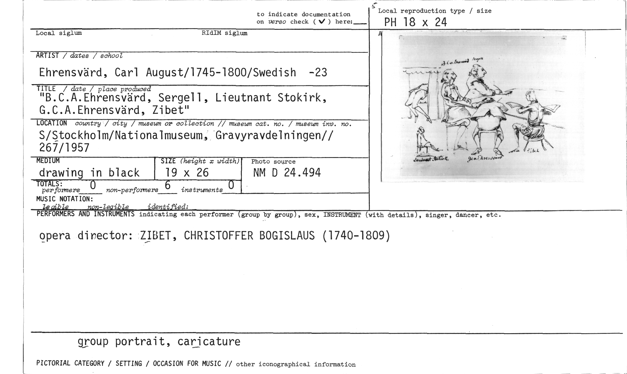 //// to indicate documentation //// on verso check ( V ) here;_ //// Local reproduction type / size //// PH 18 x 24 //// Local siglum RIdIM siglum //// ARTIST / dates / school //// Ehrensvärd, Carl August/1745-1800/Swedish -23 //// TITLE / date / place produced //// "B.C.A.Ehrensvärd, Sergel], Lieutnant Stokirk, G.C.A.Ehrensvärd, Zibet" //// LOCATION country / city / museum or collection // museum cat. no. / museum inv. no. //// S/Stockholm/Nationalmuseum,-'Gravyravdelningen// 267/1957 //// SIZE (height m width) //// drawing in black //// MEDIUM //// 19 x 26 //// Photo source //// NM D 24.494 //// per formers non -perfOrmer:15 instruments //// -TRÄLS: //// MUSIC NOTATION: //// non-leoible identified: //// PERFORMERS AND INSTRUMENTS indicating each performerrgroup by group-Y, sex, INSTRUMENT (with details), singer, dancer, etc. //// opera director: ZIBET, CHRISTOFFER BOGISLAUS (1740-1809) //// group portrait, caricature //// PICTORIAL CATEGORY / SETTING / OCCASION FOR MUSIC // other iconographical information ////