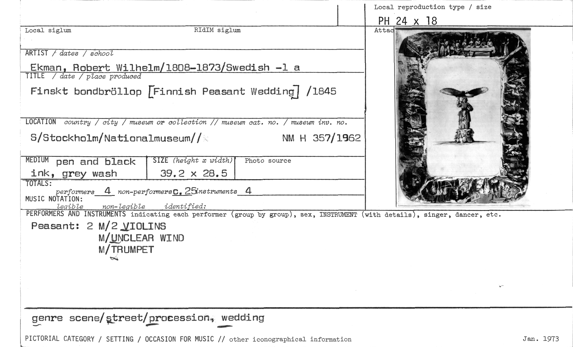 //// Local reproduction type / size //// PH 24 x 18 //// Attac //// Local siglum RIdIM siglum //// ARTIST / dates / school //// Ekman, Robert Wilhelm/1808-1873/Swedish —1 a //// TITLE / date / place produced //// Finskt bondbröllop [Finnish Peasant Wedding /1845 //// LOCATION country / city / museum or collection // museum cat. no. / museum inv. no. //// S/Stockholm/Nationalmuseum// //// NM H 357/1962 //// MEDIUM pen and black ink, grey wash //// SIZE (height x width) //// 39.2 x 28.5 //// Photo source //// performers 4 non-performersC3.2Eknstruments //// MUSIC NOTATION: //// Te ible non-le ible identi ied: //// PERFORMERS AND INSTRUMENTS indicating each performer (group //// Peasant: 2 M/2.2IOLINS //// MiUNCLEAR WIND M/TRUMPET //// 041 //// by group), sex, INSTRUMENT (with details), singer, dancer, etc. //// genre scene/Oreet/processioh4 wedding //// PICTORIAL CATEGORY / SETTING / OCCASION FOR MUSIC // other iconographical information //// Jan. 1973 //// ////