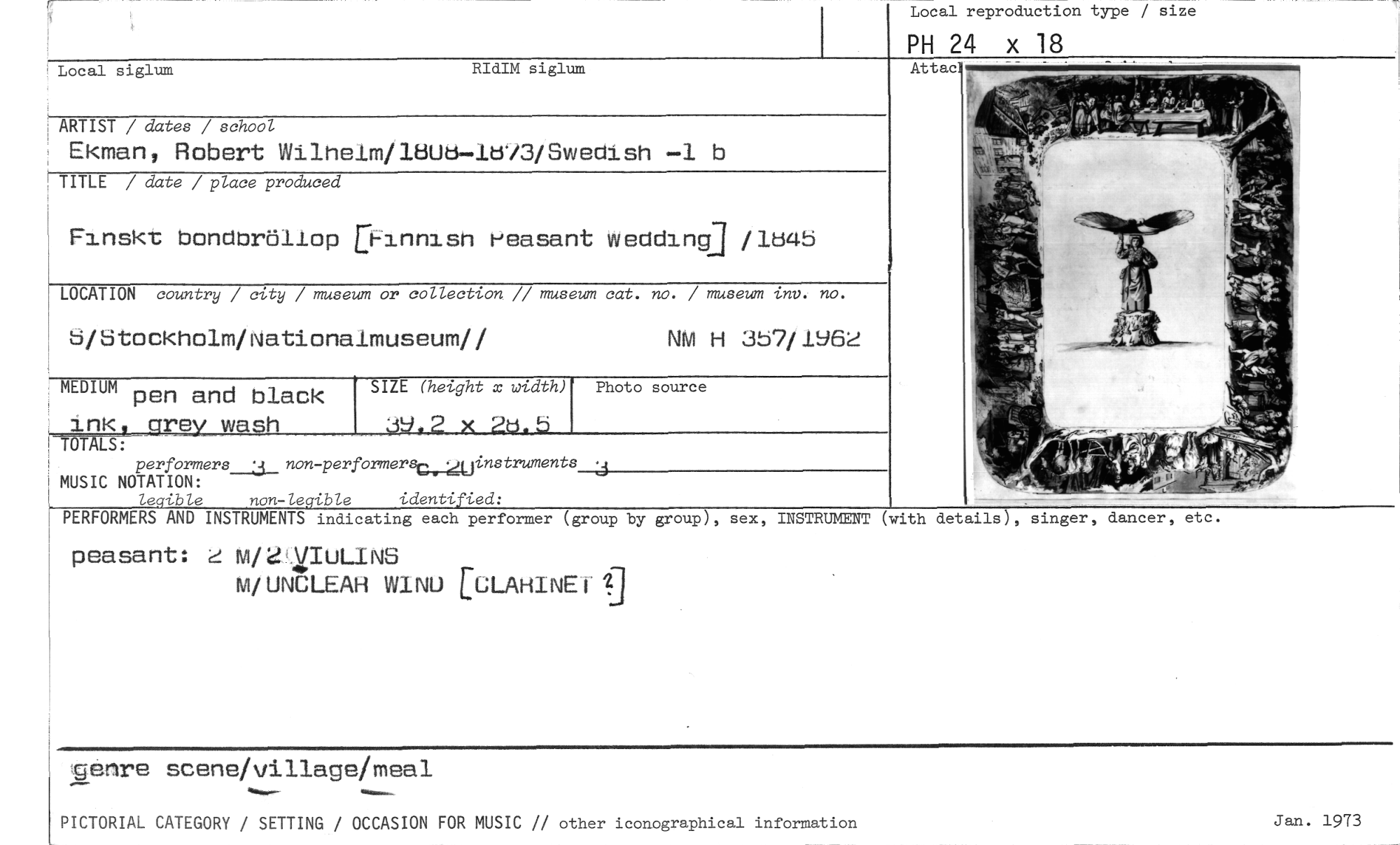 //// MEDIUM pen and black //// ink grey wagh UTEALS: //// (with details), singer, dancer, etc. //// PERFORMERS AND INSTRUMENTS indicating each performer (group by group), sex, INSTRUMENT //// peasant: d Mr2A/IULINS //// M/UNnLEAH W1NU EGLAHINEfg //// Jan. 1973 //// genre scene/village/meal //// PICTORIAL CATEGORY / SETTING / OCCASION FOR MUSIC // other iconographical information //// Local reproduction type / size //// PH 24 x 18 //// Local siglum RIdIM siglum //// ARTIST / dates / school //// Ekman, Robert Wilhelm/1 Ud—la/3/Swedish —1 b //// TITLE / date / place produced //// Finskt bondbröllop [Hinnisn Heasant wedding] /1u4b //// LOCATION country / city / museum or collection // museum cat. no. / museum inv. no. //// b/btockholm/Nationalmuseum// //// NM H 3b7/1962 //// performers 3 non -performerguinstruments //// MUSIC NOTATION: //// leclibLe non-legible identified: //// Attac //// Photo source //// SIZE (height x width) ////