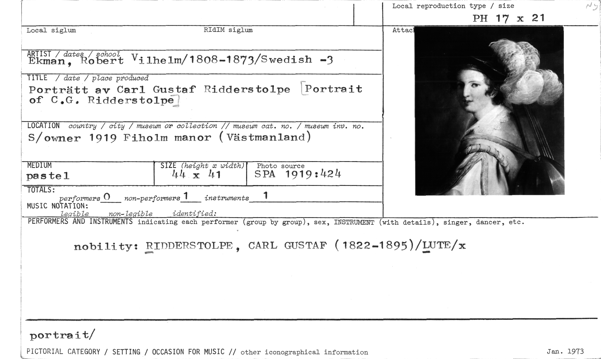 //// Local reproduction type / size //// PH 17 x 21 //// Local siglum RldIM siglum //// ARTIST / dates / school IT //// Ekman, Robert Vilhelm/1808-1873/Swedish -3 //// TITLE / date / place produced //// Porträtt av Carl Gustaf Ridderstolpe ,Portrait of C.G. Ridderstolp' //// LOCATION country / city / museum or collection // museum cat. no. / museum inv. no. //// S/owner 1919 Fiholm manor (Västmanland) //// MEDIUM pastel SIZE (height x width) Photo source //// 44 x 41 SPA 1919:424 //// //// TOTALS: //// performers 0 non-performers 1 instruments 1 //// MUSIC NOTATION: //// legible non-legible identified: //// PERFORMERS AND INSTRUMENTS indicating each performer (group by group), sex, INSTRUMENT (with details), singer, dancer, etc. //// nobility: RIDDEPSTOLPR, CARL GUSTAF (1822-1895)/LUTE/x //// Attac //// portrait/ //// LPICTORIAL CATEGORY / SETTING / OCCASION FOR MUSIC // other iconographical information Jan. 1973 ////