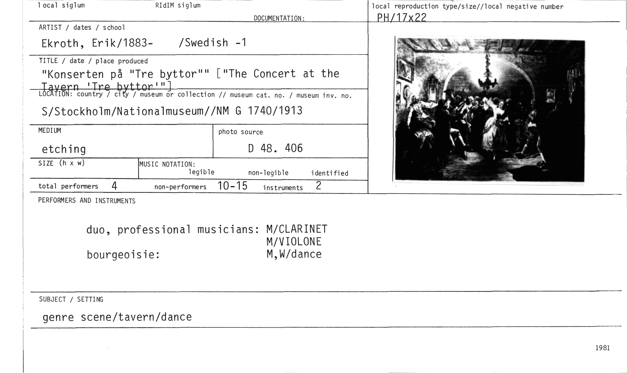 //// SUBJECT / SETTING //// genre scene/tavern/dance //// 1981 //// 1 ocal siglum R dIM siglum //// DOCUMENTATION: //// MUSIC NOTATION: //// legible //// non-legible identified //// ARTIST / dates / school //// Ekroth, Erik/1883- /Swedish -1 //// TITLE / date / place produced //// "Konserten på "Tre byttor"" ["The Concert at the //// Tayen 'Tre byttor"] //// LOCAIIuN:r country / city / museum or collection // museum cat. no. / museum inv. no. //// S/Stockholm/Nationalmuseum//NM G 1740/1913 //// photo source //// D 48. 406 //// total performers 4 non-performers 10-15 instruments 2 //// SIZE (h x w) //// PERFORMERS AND INSTRUMENTS //// duo, professional musicians: M/CLARINET //// M/VIOLONE //// bourgeoisie: M,W/dance //// local reproduction type/size//local negative number //// FH/17x22 //// MEDIUM //// etching ////