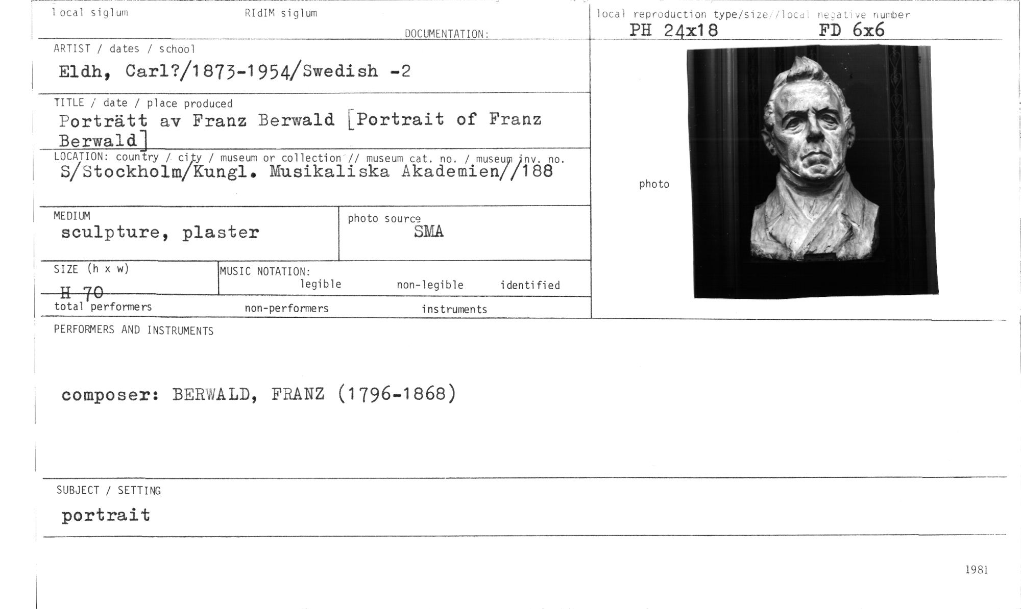 //// PERFORMERS AND INSTRUMENTS //// tomposer: BERALD, FRANZ (1796-1868) //// SUBJECT / SETTING //// portrait //// MUSIC NOTATION: //// legible //// non-legible identified //// lotal reproduction type/size:/local negative number //// PH 24x18 FD 6x6 //// photo //// 1 otal siglum RIdIM siglum //// DOCUMENTATION: //// ARTIST / dates / school //// 1 Eldh, Carl?/1873-1954/Swedish -2 //// TITLE / date / place produced //// Porträtt av Franz Berwald [Portrait of Franz Berwald] //// LOCATION: country / city / museum or collection // museum cat. no. / museum Pis/. no. //// S/Stockholm/Kungl. Musikaliska Akademien//188 //// MEDIUM //// sculpture, plaster //// photo source //// SMA //// SIZE (h x w) //// H //// total70 performers //// non-performers instruments //// 1981 ////