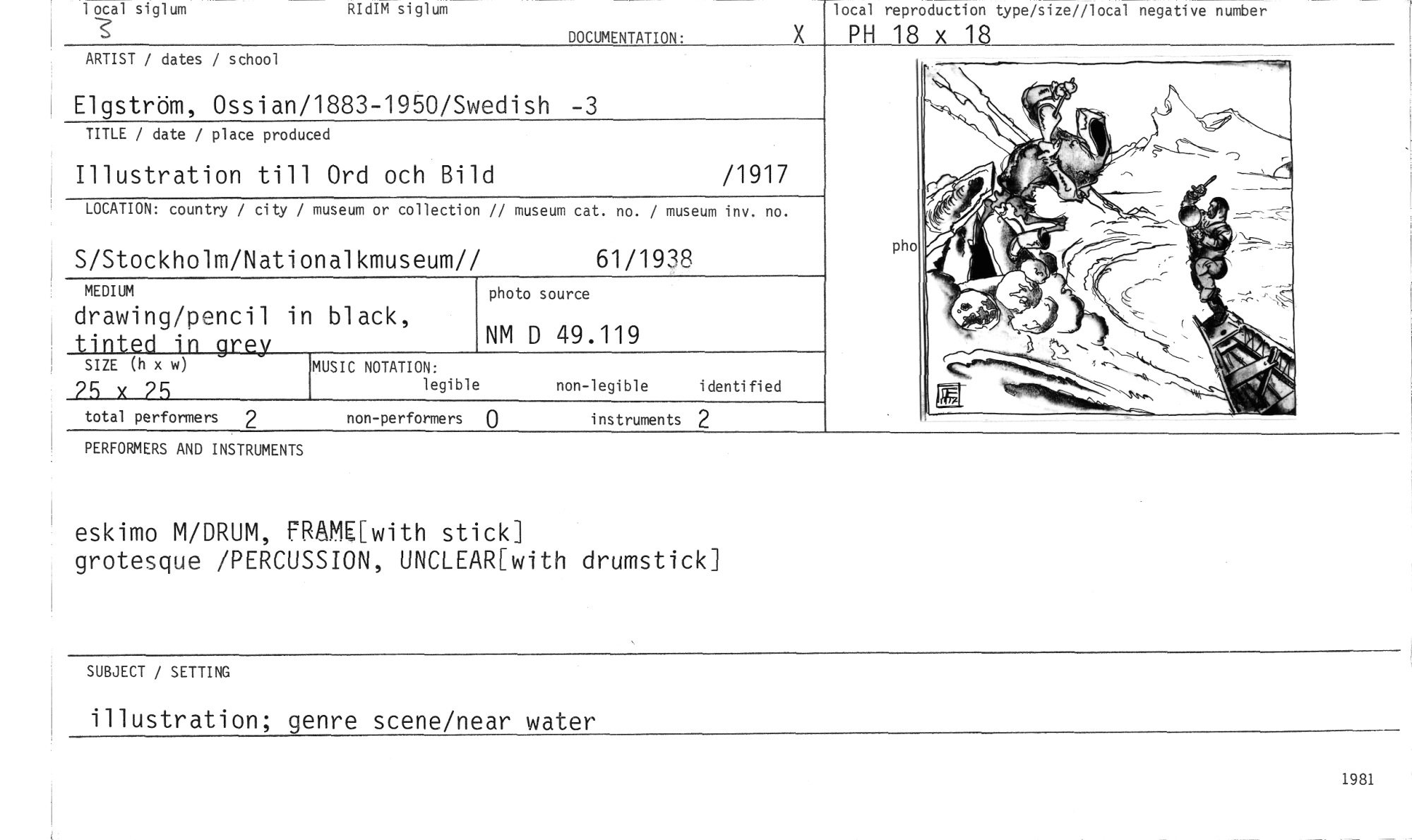 //// PERFORMERS AND INSTRUMENTS //// eskimo M/DRUM, FRAME[with stick] //// grotesque /PERCUSSION, UNCLEAR[with drumstick] //// total performers 2 //// non-performers 0 instruments 2 //// MUSIC NOTATION: //// legible //// non-legible identified //// 1 ocal siglum //// RIdIM siglum //// DOCUMENTATION: //// local reproduction type/size//local negative number //// PH 18 x 18 //// ARTIST / dates / school //// Elgström, Ossian/1883-1950/Swedish - //// TITLE / date / place produced //// Illustration till Ord och Bild /1917 //// LOCATION: country / city / museum or collection // museum cat. no. / museum inv. no. //// S/Stockholm/Nationalkmuseum// 61/1938 //// MEDIUM //// drawing/pencil in black, //// tinted in grey //// SIZE (h x w) //// 25 x 25 //// photo source //// NM D 49.119 //// SUBJECT / SETTING //// illustration; genre scene/near water //// 1981 ////