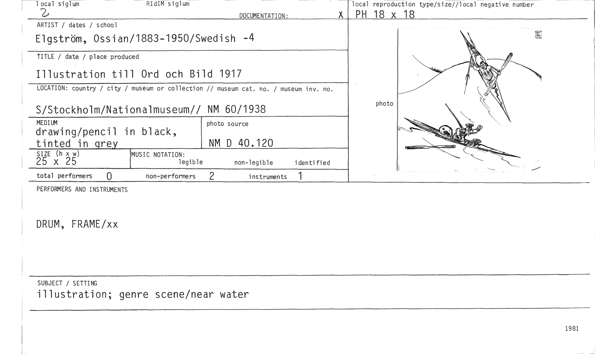 //// 1 ocal siglum //// RIdIM siglum //// DOCUMENTATION: //// local reproduction type/size//local negative number //// PH 18 x 18 //// ARTIST/ dates / school //// Elgström, Ossian/1883-1950/Swedish -4 //// TITLE / date / place produced //// Illustration till Ord och Bild 1917 //// LOCATION: country / city / museum or collection // museum cat. no. / museum inv. no. //// S/Stockholm/Nationalmuseum// NM 60/1938 //// MEDIUM //// drawing/pencil in black, //// tinted in grey //// SIZE (h x w) //// 25 x 25 //// MUSIC NOTATION: //// legible non-legible identified //// photo source //// NM D 40.120 //// photo //// total performers 0 non-performers 2 instruments 1 //// PERFORMERS AND INSTRUMENTS //// DRUM, FRAME/xx //// SUBJECT / SETTING //// illustration; genre scene/near water //// 1981 ////