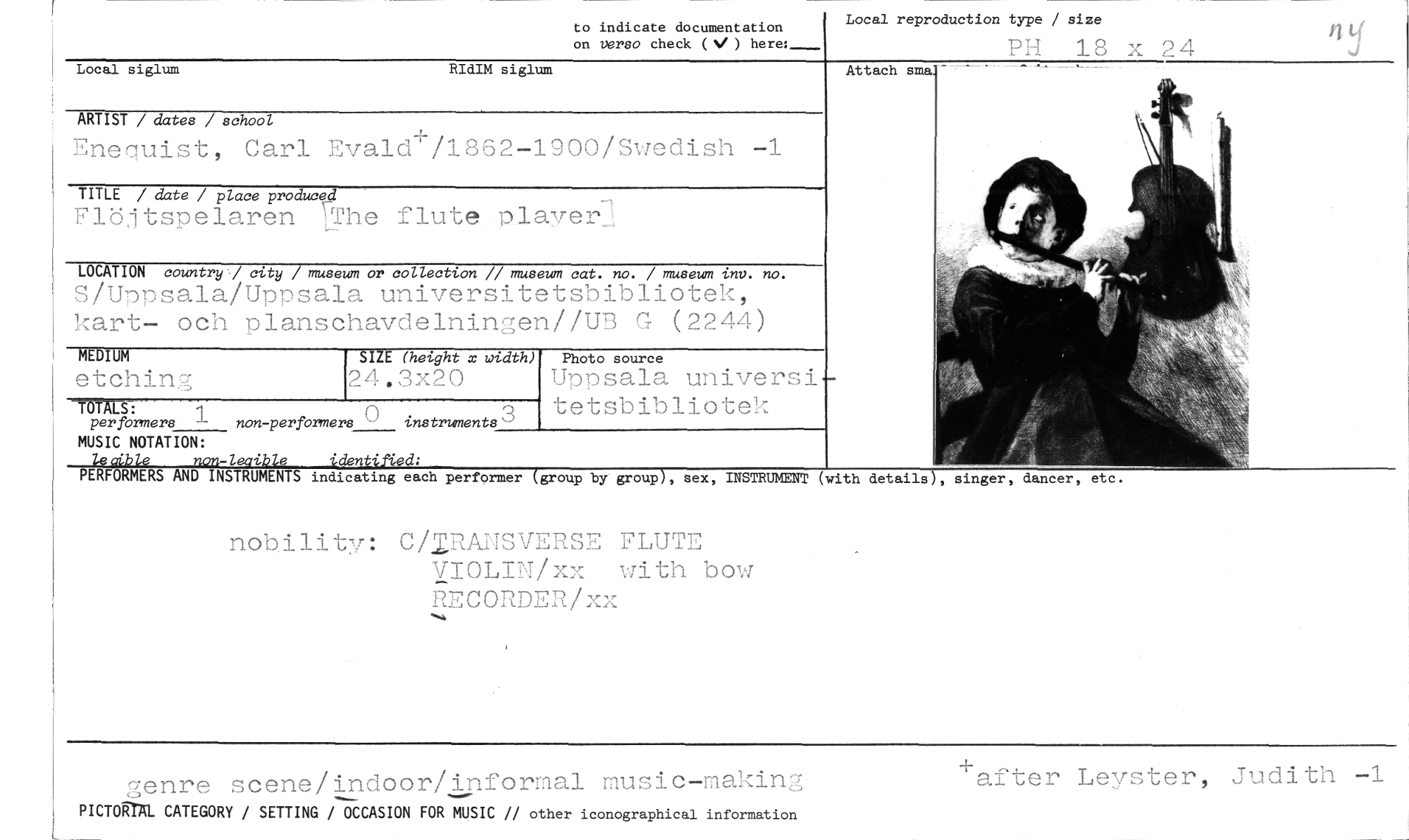 //// to indicate documentation //// on verso check (V) here:___ //// Local reproduction type / size //// PH 18 x 24 //// Local siglum RIdIM siglum //// ARTIST / dates / school //// Enequist, Carl Evald/1862-1900/Swedish -1 //// TITLE / date / place produced //// Flöltspelaren )-The flute olayer //// LOCATION country] city / museum or collection // museum cat. no. / museum imv. no. //// S/Uppsala/Uppsala universitetsbibliotek, kart- och planschavdelningen//UB G (2244) //// MEDIUM //// etching //// TOTACS: //// 1 //// per formers non-performers instruments 3 //// MUSIC NOTATION: //// lecible ncm-leaible identified: //// PERFORMERS AND INSTRUMENTS indicating each performer (group by group), sex, INSTRUMENT //// nobilitv: C/IRANSVERSE FLUTE //// VIOLIN/xx with bota/ RECORDER/xx //// SIZE (height x width) //// 24.3x20 //// Photo source //// Uppsala universitetsbibliotek //// Attach s //// ith details , singer, dancer, etc. //// genre scene/indoor/informal music-making //// PICTOCAL CATEGORY / SETTING / OCCASION FOR MUSIC other iconographical information //// after Leyster, Judith -1 ////
