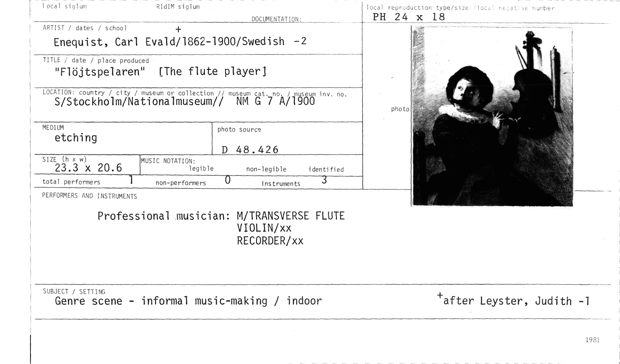 //// 1981 //// TITLE i date / place produ //// "Flöjtspelaren //// ed //// " [The flute played //// museum or collection // museum cat. no. / museum inv. no. //// tionalmuseum// NM G 7 A/1900 //// LOCATION: country / city / //// S/Stockholm/Na //// total performers //// non-performers 0 instruments //// after Leyster, Judith -1 //// SUBJECT / SETTING //// Genre scene - informal music-making / indoor //// local siglum RIdIM siglum //// DOCUMENTATION: //// ARTIST / dates / school //// Enequist, Carl Evald/1862-1900/Swedish -2 //// MEDIUM //// etching //// D 48.426 //// MUSIC NOTATION: //// legible non-legible identified //// PERFORMERS AND INSTRUMENTS //// Professional musician: M/TRANSVERSE FLUTE //// VIOLIN/xx RECORDER/xx //// local reproduction type/size,floca neaCve number //// PH 24 x 18 //// SIZE (h x w) //// 23.3 x 20.6 //// photo source //// photo ////
