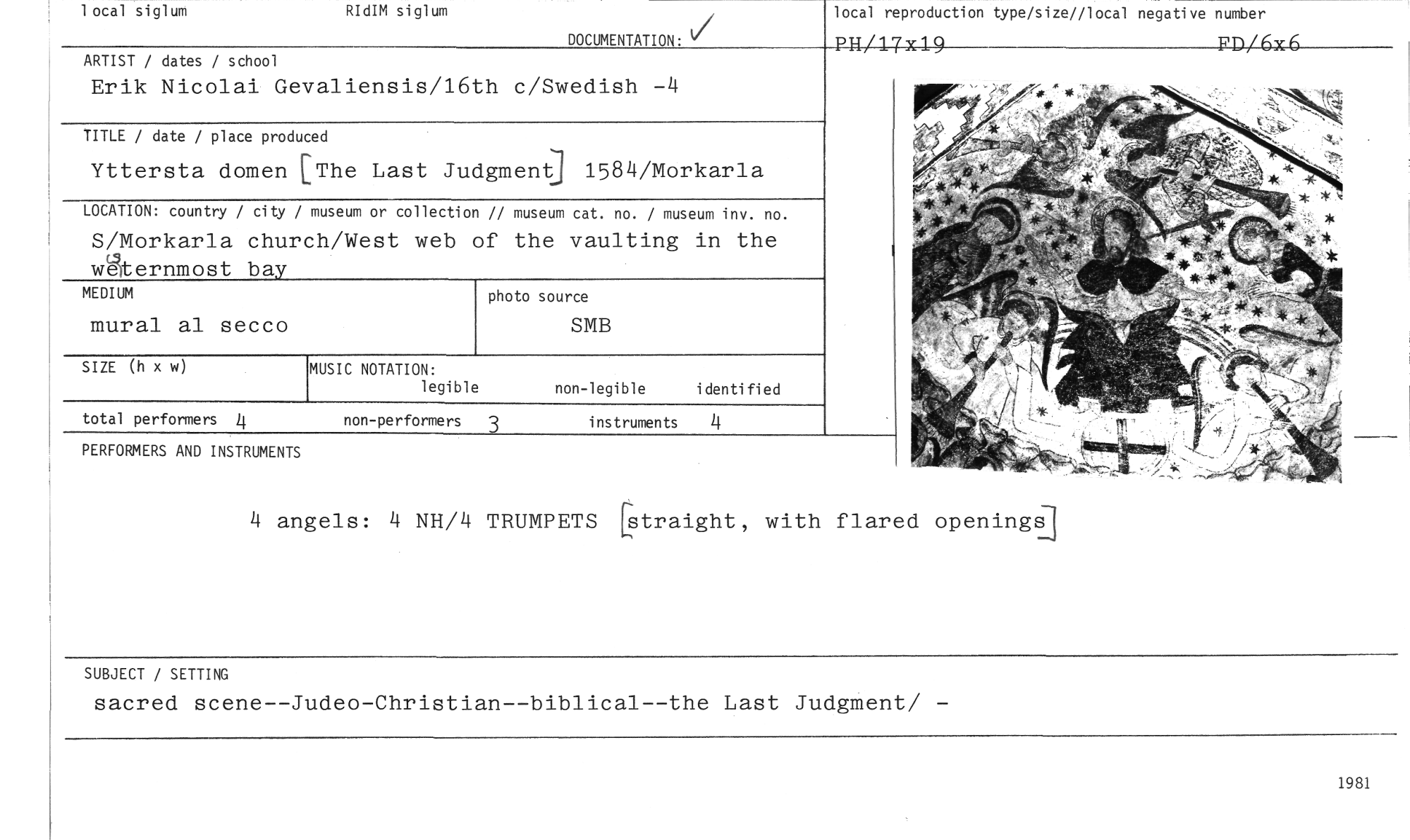 //// local siglum RIdIM siglum //// DOCUMENTATION: //// local reproduction type/size//local negative number //// PH/17x19 FD/6x6 //// ARTIST / dates / school //// Erik Nicolai Gevaliensis/16th c/Swedish —4 //// TITLE / date / place produced //// Yttersta domen [The Last Judgment] 1584/Morkarla //// LOCATION: country / city / museum or collection // museum cat. no. / museum inv. no. //// S/Morkarla church/West web of the vaulting in the wgternmost bay //// MEDIUM photo source //// mural al secco SMB //// SIZE (h x w) //// non-legible identified //// total performers 4 non-performers 3 instruments 4 //// PERFORMERS AND INSTRUMENTS //// MUSIC NOTATION: //// legible //// 4 angels: 4 NH/4 TRUMPETS traight, with flared openingS] //// SUBJECT / SETTING //// sacred scene--Judeo-Christian--biblical--the Last Judgment/ - //// 1981 ////