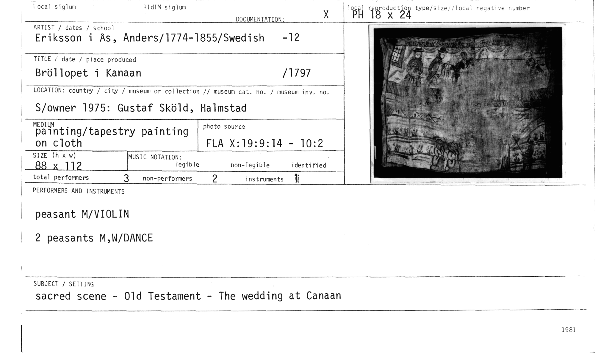 //// iocal siglum RIdIM siglum //// localPH reproductio24n type/size//local negative number //// 18 x //// DOCUMENTATION: //// 1981 //// 3 //// total performers //// non-performers instruments //// MUSIC NOTATION: //// legible //// non-legible identified //// ARTIST / dates / school //// Eriksson i As, Anders/1774-1855/Swedish -12 //// TITLE / date / place produced //// Bröllopet i Kanaan /1797 //// LOCATION: country / city / museum or collection // museum cat. no. / museum inv. no. //// S/owner 1975: Gustaf Sköld, Halmstad //// MEDI14 //// painting/tapestry painting on cloth //// SIZE (h x w) //// 88 x 112 //// PERFORMERS AND INSTRUMENTS //// peasant M/VIOLIN //// 2 peasants M,W/DANCE //// photo source //// FLA X:19:9:14 - 10:2 //// SUBJECT / SETTING //// sacred scene - Old Testament - The wedding at Canaan ////