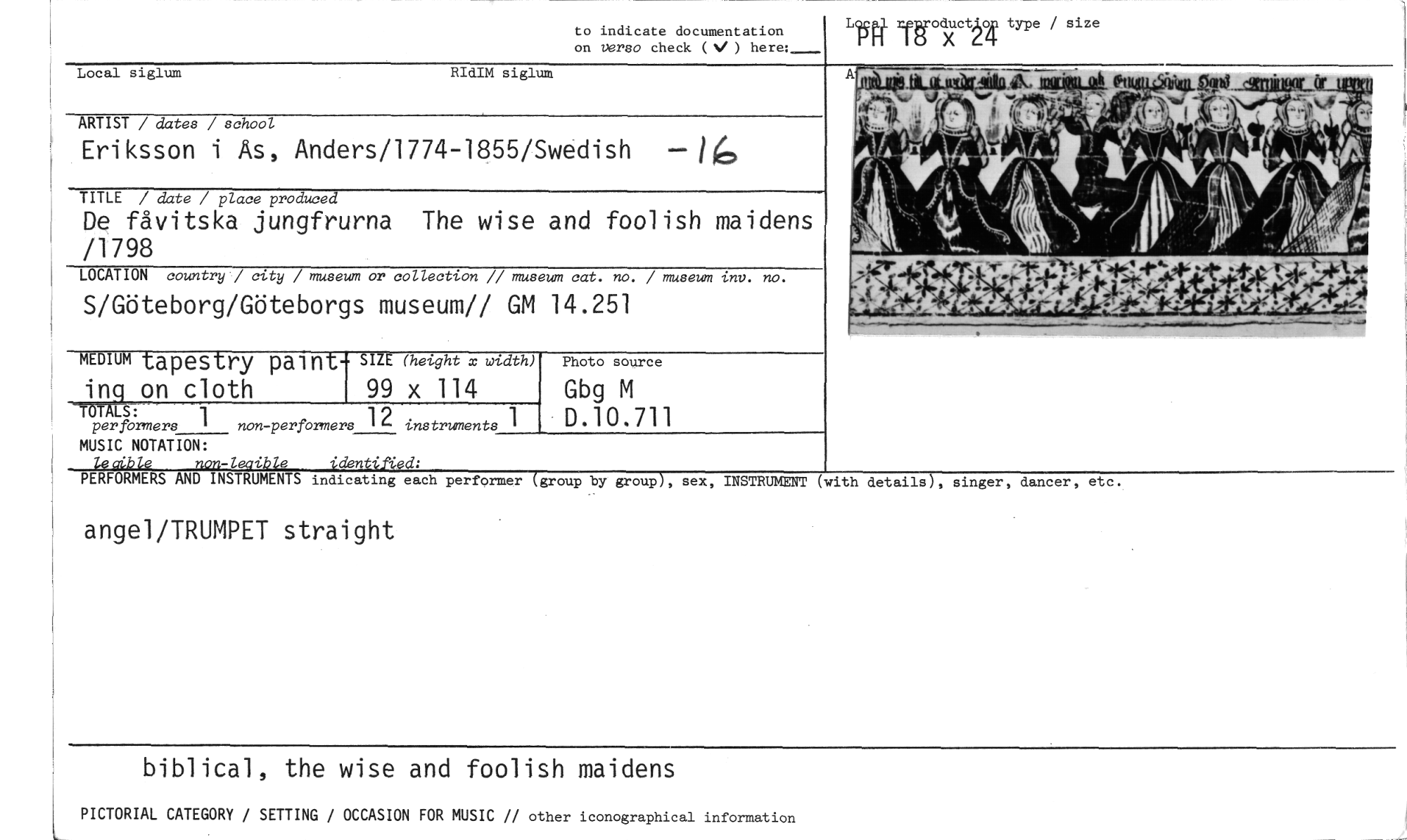 //// to indicate documentation //// on verso check (V ) here:- //// Lo type / size //// Local siglum RIdIM siglum //// Salte ott0,4511411.090 //// - //// k MY, //// ARTIST / dates / school //// Eriksson i As, Anders/1774-1855/Swedish //// TITLE / date / place produced //// De fåvitska jungfrurna The wise and foolish maidens /1798 //// LOCATION country / city / museum or collection // museum cat. no. / museum inv. no. //// S/Göteborg/Göteborgs museum// GM 14.251 //// MEDIUM tapestry paint- SIZE (height x width) //// ing on cloth 99 x 114 //// Photo source //// Gbg M D.10.711 //// —TrArr_S : //// per formers 1 non-performers 12 instruments 1 //// ith details), singer, dancer, etc. //// MUSIC NOTATION: //// lecible non-leaible identified: //// PERFORMERS AND INSTRUMENTS indicating each performer (group by group), sex, INSTRUMENT //// angel/TRUMPET straight //// biblical, the wise and foolish maidens //// PICTORIAL CATEGORY / SETTING / OCCASION FOR MUSIC // other iconographical information ////