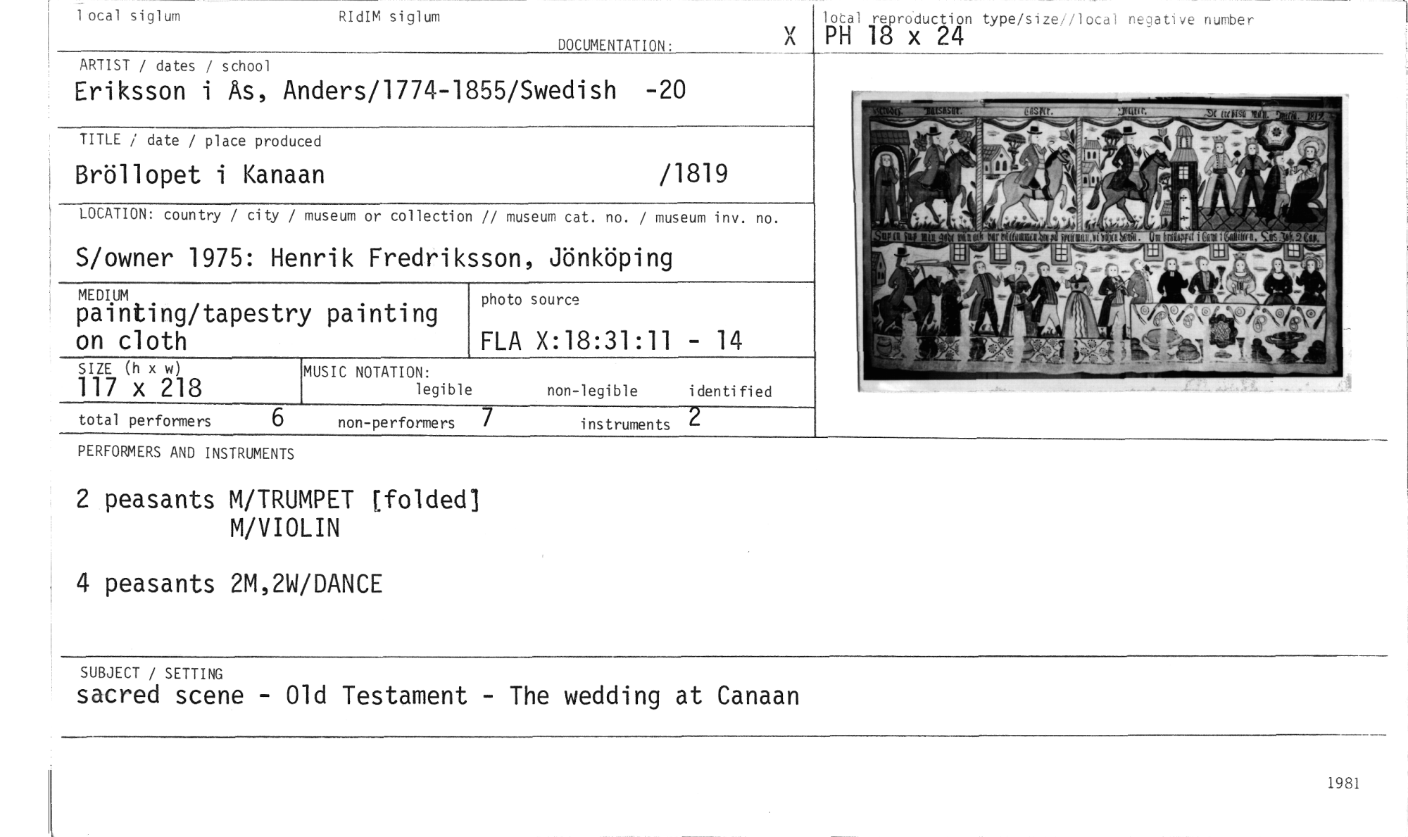 //// focal siglum RIdIM siglum lotal rep x 24 //// type/size//local negative number //// DOCUMENTATION: X PH 18 //// PERFORMERS AND INSTRUMENTS //// 2 peasants M/TRUMPET [folded] //// M/VIOLIN //// 4 peasants 2M,2W/DANCE //// SUBJECT / SETTING //// sacred scene - Old Testament - The wedding at Canaan //// 1981 //// MUSIC NOTATION: //// legible //// non-legible identified //// ARTIST / dates / school //// Eriksson i As, Anders/1774-1855/Swedish -20 //// TITLE / date / place produced //// Bröllopet i Kanaan /1819 //// LOCATION: country / city / museum or collection // museum cat. no. / museum inv. no. //// S/owner 1975: Henrik Fredriksson, Jönköping //// MEDIUM //// painting/tapestry painting on cloth //// SIZE (h x w) //// 117 x 218 //// total performers 6 non-performers 7 instruments 2 //// photo source //// FLA X:18:31:11 - 14 ////