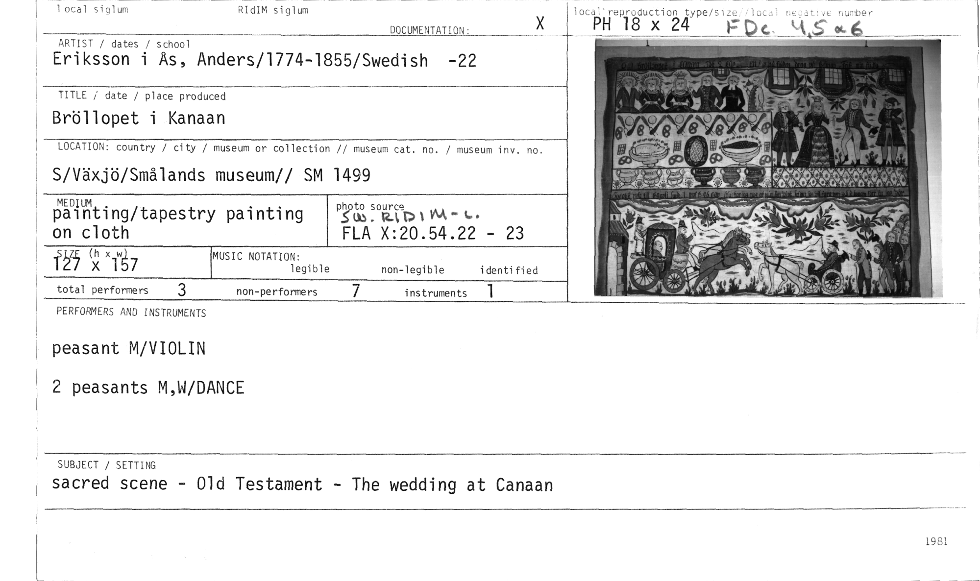 //// PERFORMERS AND INSTRUMENTS //// peasant M/VIOLIN //// 2 peasants M,W/DANCE //// SUBJECT / SETTING //// sacred scene - Old Testament - The wedding at Canaan //// MUSIC NOTATION: //// legible //// non-performers //// 1 otal siglum //// RIdIM siglum //// total performers //// 3 //// DOCUMENTATION: //// ARTIST / dates / school //// Eriksson i As, Anders/1774-1855/Swedish -22 //// TITLE / date / place produced //// Bröllopet i Kanaan //// LOCATION: country / city / museum or collection // museum cat. no. / museum inv. no. //// S/Växjö/Smålands museum// SM 1499 //// local'reproduction type/sizeilocal neuatkie number //// PH 18 x 24 F' Dc. Å S 4y. //// NR rt 'L //// -01 //// ,,,emis„,z,x, • _.11. 11."mincomt,,,v"v„,,,,,94. //// ..a-z.-...eytterdztrommeogs-,94. //// mEinum //// painting/tapestry painting on cloth //// photo source //// FLA X:20.54.22 - 23 //// non-legible identified //// I ä (;1( x-67 ////