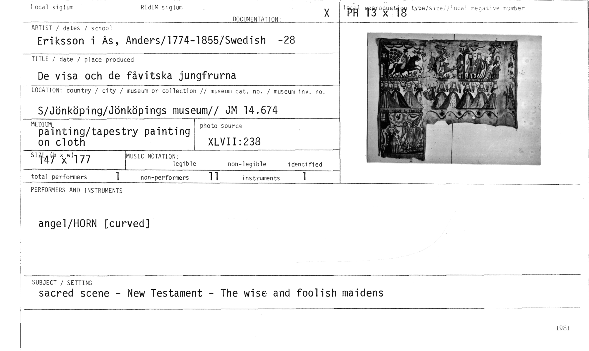 //// lotal siglum RIdIM siglum //// DOCUMENTATION: //// lp ,l iftectig type/sizei/local negative number //// ARTIST / dates / school //// Eriksson i As, Anders/1774-1855/Swedish -28 //// TITLE / date / place produced //// De visa och de fåvitska jungfrurna //// LOCATION: country / city / museum or collection // museum cat. no. / museum inv. no. //// S/Jönköping/Jönköpings museum// JM 14.674 //// MEDIUM //// painting/tapestry painting on cloth //// MUSIC NOTATION: //// legible non-legible identified //// total performers 1 non-performers 11 instruments 1 //// E47 X"")177 //// photo source //// XLV11:238 //// PERFORMERS AND INSTRUMENTS //// angel/HORN kurved] //// SUBJECT / SETTING //// sacred scene - New Testament - The wise and foolish maidens //// 1981 ////