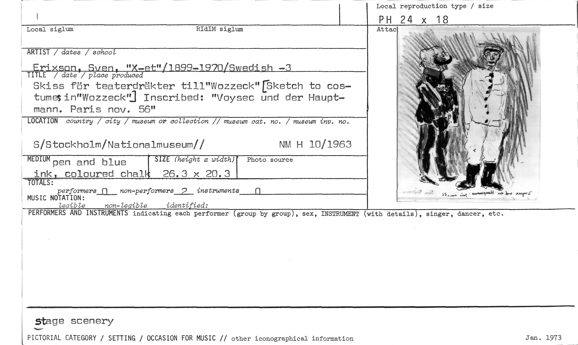 //// Local reproduction type / size //// PH 24 x 18 //// Attac //// ARTIST / dates / school //// Erixsnn, Sven, "X—et"/1699-1970/Swedish —3 //// TITLE / date / place produced //// Skiss för teaterdräkter till"Wozzeck"Pketch to costumesin"Wozzeck'g Inscribed: "Voysec und der Hauptmann. Paris nov. 56" //// LOCATION country / city / museum or collection // museum cat. no. / museum tnv. no. //// S/Stockholm/Nationalmuseum// NM H 10/1963 //// MEDIUM pen and blue ink, coloured chalk SIZE (height x width) Photo source //// 26.3 x 20.3 //// //// TOT LS: //// performers_11_ non -performers 7 instruments MUSIC NOTATION: //// leqible non-leqible identified: //// PERFORMERS AND INSTRUMENTS indicating each performer (group by group), sex, INSTRUMENT (with details), singer, dancer, etc. //// Stage scenery //// fl //// Local siglum RIdIM siglum //// PICTORIAL CATEGORY / SETTING / OCCASION FOR MUSIC // other iconographical information //// Jan. 1973 ////