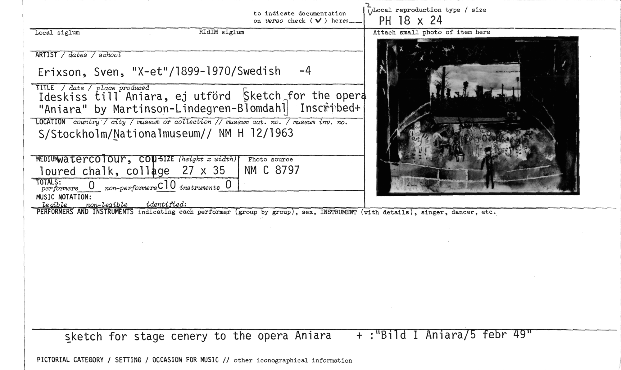 //// to indicate documentation //// on verso check (V ) here:___ //// '2. //// vLocal reproduction type / size //// PH 18 x 24 //// Attach small photo of item here //// ARTIST / dates / school //// Erixson, Sven, "X-et"/1899-1970/Swedish -4 //// TITLE / date / place produced //// Ideskiss till Aniara, ej utförd ketch for the opera //// "Aniara" by Martinson-Lindegren-Blomdahll Inscrl'bed+ //// LOCATION country / city / museum or collection // museum cat. no. / museum inv. no. //// S/Stockholm/Nationalmuseum// NM H 12/1963 //// MEDIUMA atercolour, cou -SIZE (height x width) //// loured chalk, collage 27 x 35 -"ITTAITT— //// per formers n u non-performersd 0 instruments //// MUSIC NOTATION: //// leaible non-loaible identi;fied; //// PERFORMERS AND INSTRUMENTS indicating each performer (group by group), sex, INSTRUMENT (with details), singer, dancer, etc. //// sketch for stage cenery to the opera Aniara + :"Bild I Aniara/5 febr 49" //// PICTORIAL CATEGORY / SETTING / OCCASION FOR MUSIC // other iconographical information //// Local siglum RIdIM siglum //// 0 //// Photo source //// NM C 8797 ////