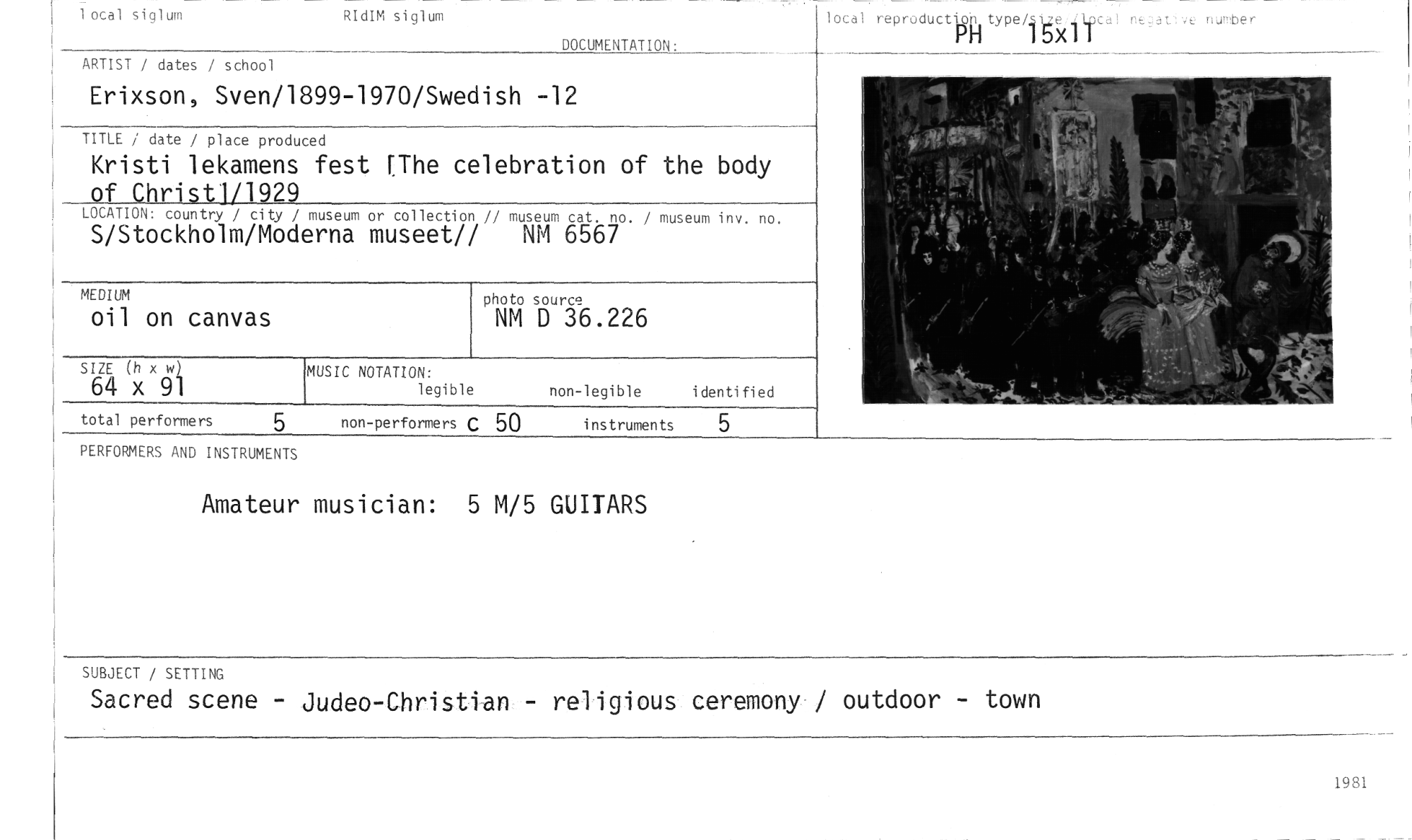//// 1 ocal siglum RIdIM siglum //// DOCUMENTATION. //// ARTIST / dates / school //// Erixson, Sven/1899-1970/Swedish -12 //// TITLE / date / place produced //// Kristi lekamens fest [The celebration of the body of Christ]/1929 //// museum or collection // museum cat. no. / museum inv. no. //// erna museet// NM 6567 //// photo source //// NM D 36.226 //// MUSIC NOTATION: //// legible non-legible identified local reproductpktype/- //// 15X11 //// LOCATION: country / city / //// S/Stockholm/Mod //// MEDIUM //// oil on canvas //// SIZE (h x w) //// 64 x 91 //// total performers 5 non-performers C 50 instruments 5 //// PERFORMERS AND INSTRUMENTS //// Amateur musician: 5 M/5 GUITARS //// SUBJECT / SETTING //// Sacred scene - Judeo-Christian - religious ceremony / outdoor - town //// 1981 ////