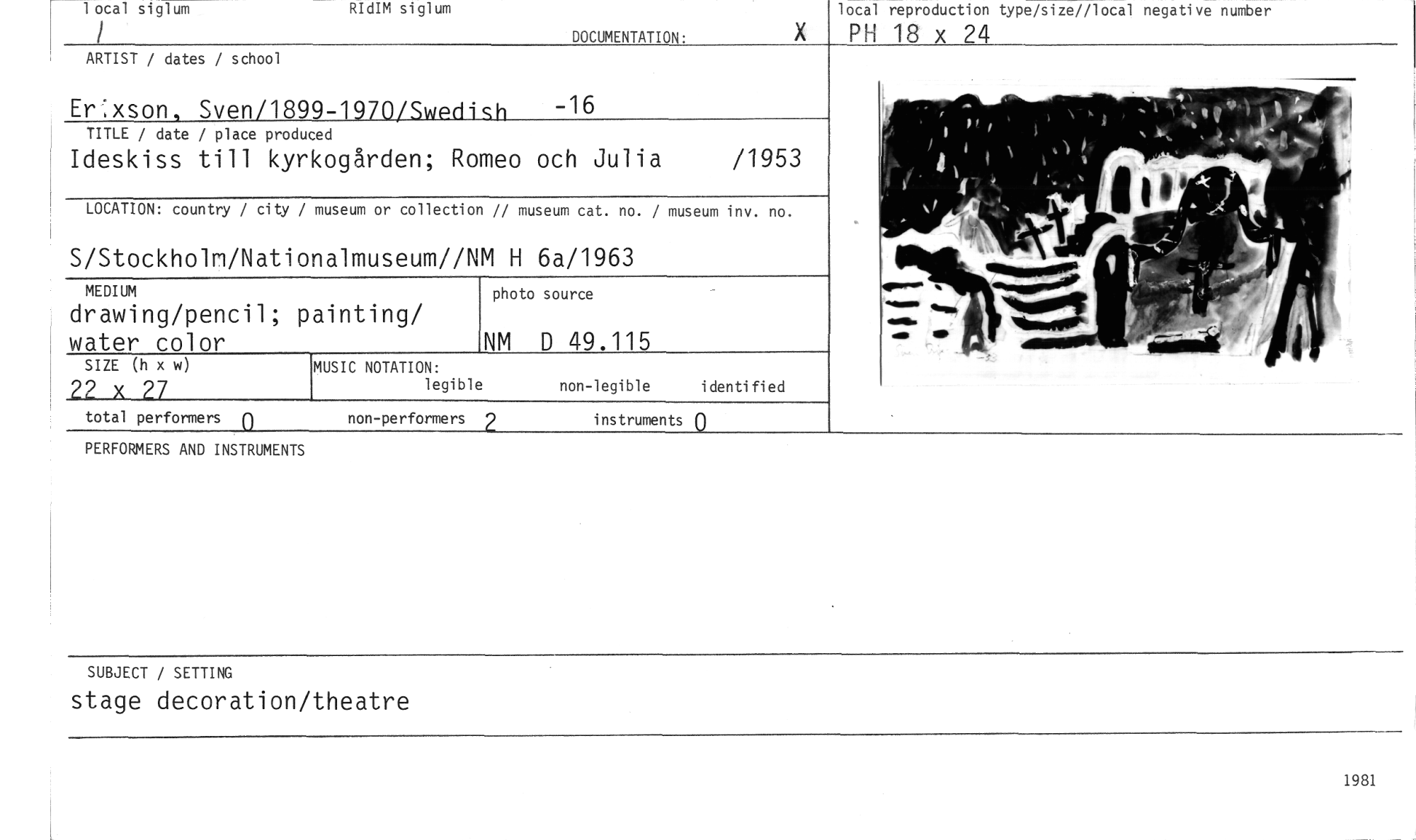 //// local siglum //// RIdIM siglum //// DOCUMENTAT ON. //// local reproduction type/size//local negative number //// PH 18 x 24 //// ARTIST / dates / school //// Er:xson Sven/1899-1970/Swedib //// TITLE / date / place produced //// Ideskiss till kyrkogården; Romeo och Julia /1953 //// LOCATION: country / city / museum or collection // museum cat. no. / museum inv. no. //// S/Stockholm/Nationalmuseum//NM H 6a/1963 //// MEDIUM //// drawing/pencil; painting/ water color //// SIZE (h x w) //// ?2 x ?7 //// -16 //// MUSIC NOTATION: //// legible //// NM D 49.115 //// photo source //// non-legible identified //// total performers non-performers 2 instruments 0 //// PERFORMERS AND INSTRUMENTS //// SUBJECT / SETTING //// stage decoration/theatre //// 1981 ////