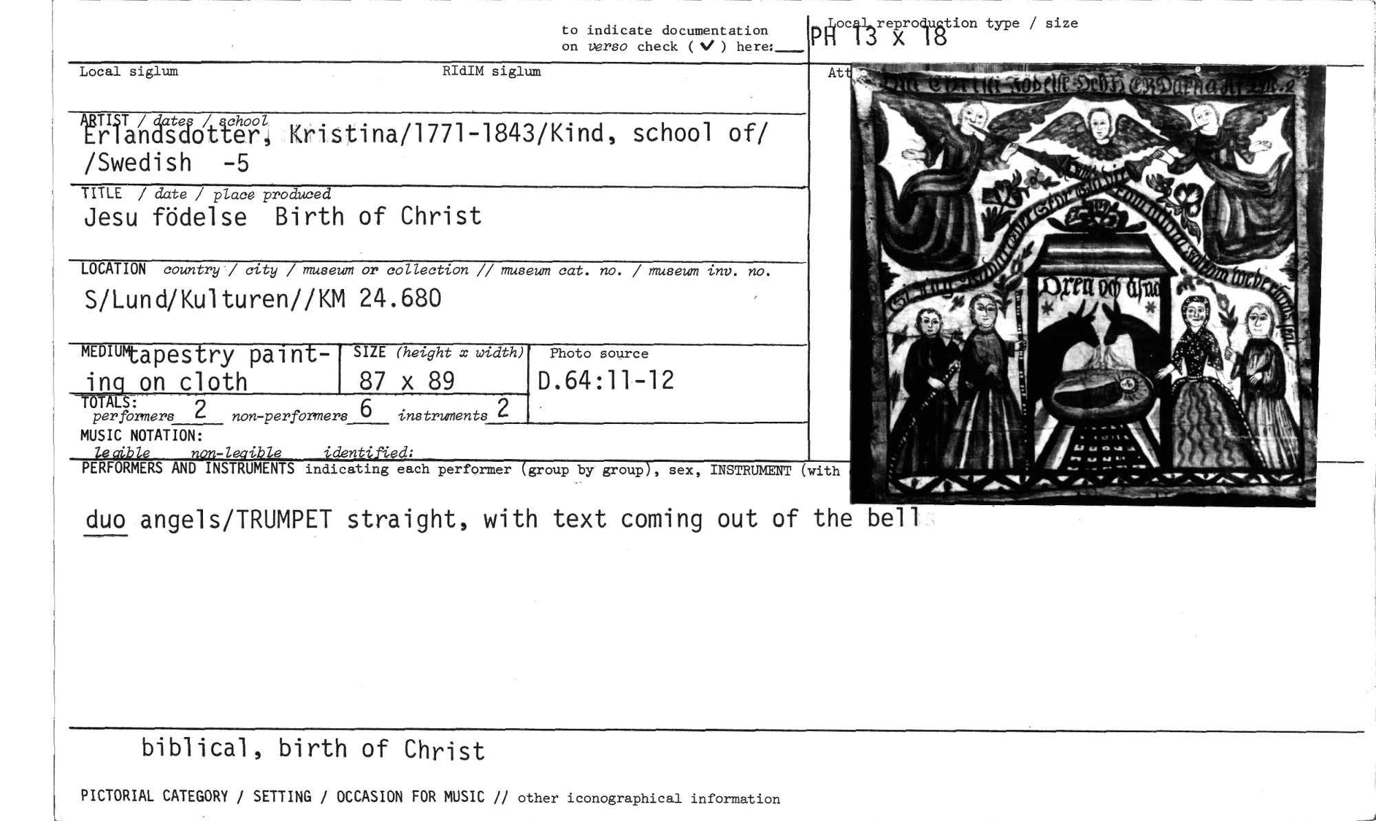 //// to indicate documentation //// on verso check (V ) here:_..— //// Local siglum RIdIM siglum //// Mailtädtt Kr'istina/1771-1843/Kind, school of/ //// /Swedish -5 //// TITLE / date / place produced //// Jesu födelse Birth of Christ //// LOCATION country / city / museum or collection // museum cat. no. / museum inv. no. //// S/Lund/Kulturen//KM 24.680 //// p 14ocai X l,reproolpAtion type / size //// I ö //// MEDIUMta pestry paint- SIZE (height x width) //// ing on cloth 87 x 89 //// TTTALS: //// per formers g non-perprmers 6 instruments 2 //// Photo source //// D.64:11-12 //// MUSIC NOTATION: //// /-.i. e 'dent 'ed: //// PERFORMERS AND INSTRUMENTS indicating each performer group by group //// , sex, INSTRUMENT (with //// duo angels/TRUMPET straight, with text coming out of the bell //// biblical, birth of Christ //// PICTORIAL CATEGORY / SETTING / OCCASION FOR MUSIC // other iconographical information ////