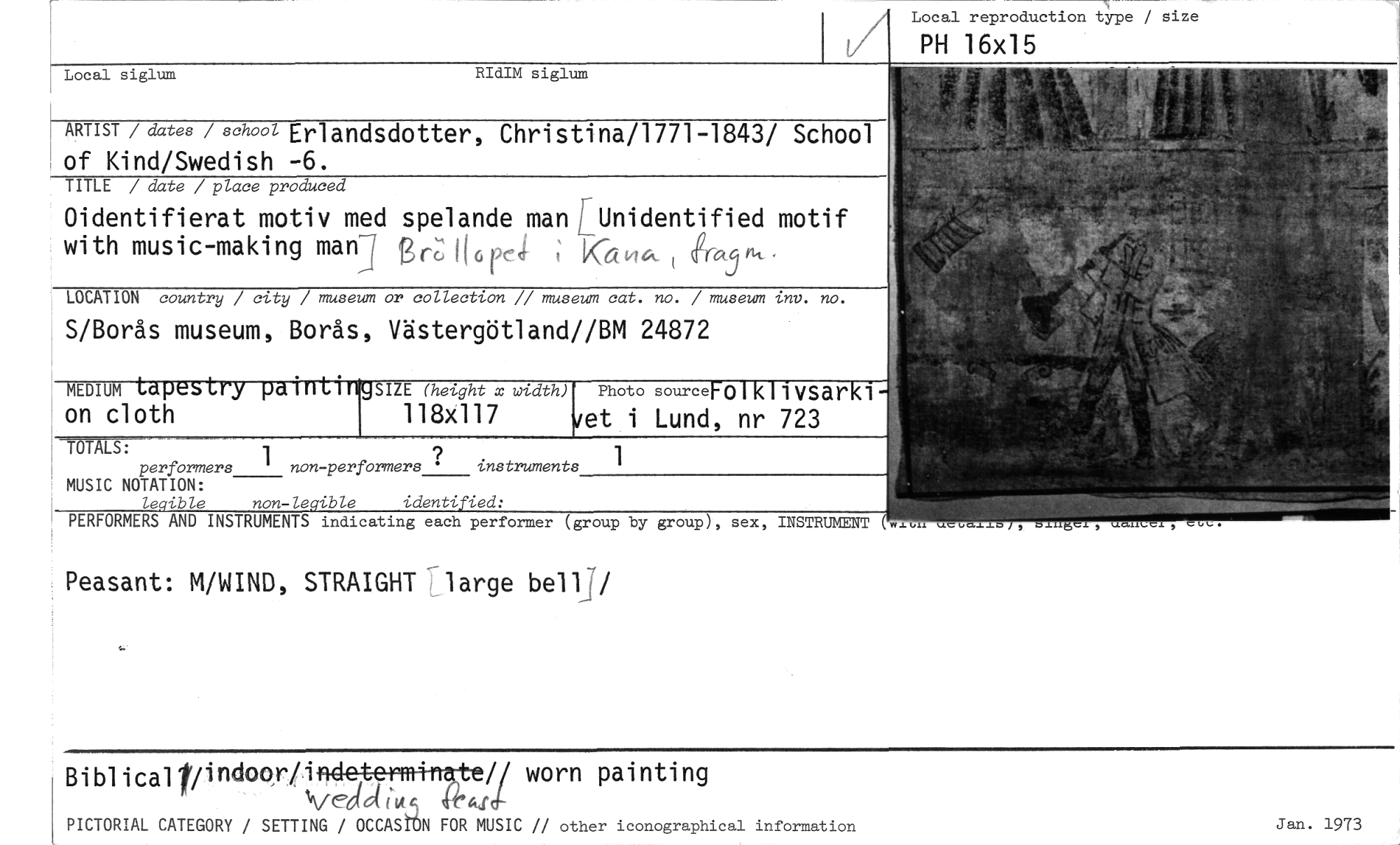 //// Local reproduction the / size //// PH 16x15 //// Local siglum RIdIM siglum //// ARTIST / dates / school Erlandsdotter, Christina/1771-1843/ School of Kind/Swedish -6. //// TITLE / date / place produced //// Oidentifierat motiv med spelande man L Unidentified motif with music-making man] B Kä r 4,5 ii, //// LOCATION country / city / museum or collection // museum cat. no. / museum inv. no. //// S/Borås museum, Borås, Västergötland//BM 24872 //// SIZE (height x width) //// 118x117 //// MEDIUM //// on cl oth //// Photo source 0 ivsar //// iet i Lund, nr 723 //// TOTALS: 71 //// performers non-perprmers • instruments //// MUSIC NOTATION: //// legible non-legible identified: //// PERFORMERS AND INSTRUMENTS indicating each performer (group by group), sex, INSTRUMENT i." //// Peasant: M/WIND, STRAIGHT large be117/ //// BiblicalVindoo,r/i~~// worn painting Vedd ('ut 4t6tai- //// PICTORIAL CATEGORY / SETTING / OCCASttN FOR MUSIC // other iconographical information //// Jan. 1973 //// //// G to ////