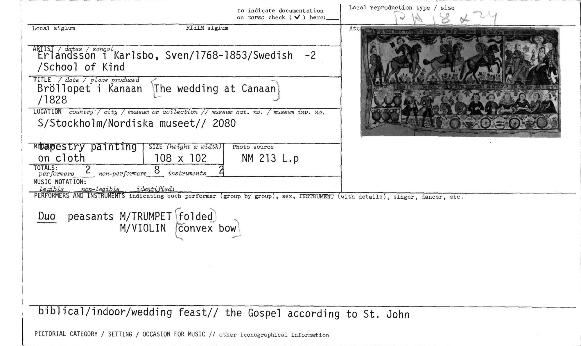 //// Local reproduction type / size //// A //// to indicate documentation on versa check (N/ ) //// Local siglum RIdIM siglum //// AUSTA-rSåsnchi°1 //// KarlSbo, Sven/1768-1853/Swedish /School of Kind //// TITLE / date / place produced //// Bröllopet i Kanaan \The wedding at Canaaw /1828 //// LOCATION country / city / museum or collection 7/ museum cat. no. / museum inv. no. //// S/Stockholm/Nordiska museet// 2080 //// mapestry painting on cloth //// SIZE (height x width) //// 108 x 102 Photo source //// NM 213 L.p //// -TIOTALS: 9 //// performers non-perfOrmers 8 instruments //// MUSIC NOTATION: //// non-leaible identified: //// PERFORMERS AND INSTRUMENTS indicating each performer (group by group), sex, //// Duo peasants M/TRUMPETgolded: //// M/VIOLIN konveX bow //// INSTRUMENT (with details), singer, dancer, etc. //// biblical/indoor/wedding feast// the Gospel according to St. John //// PICTORIAL CATEGORY / SETTING / OCCASION FOR MUSIC // other iconographical information ////
