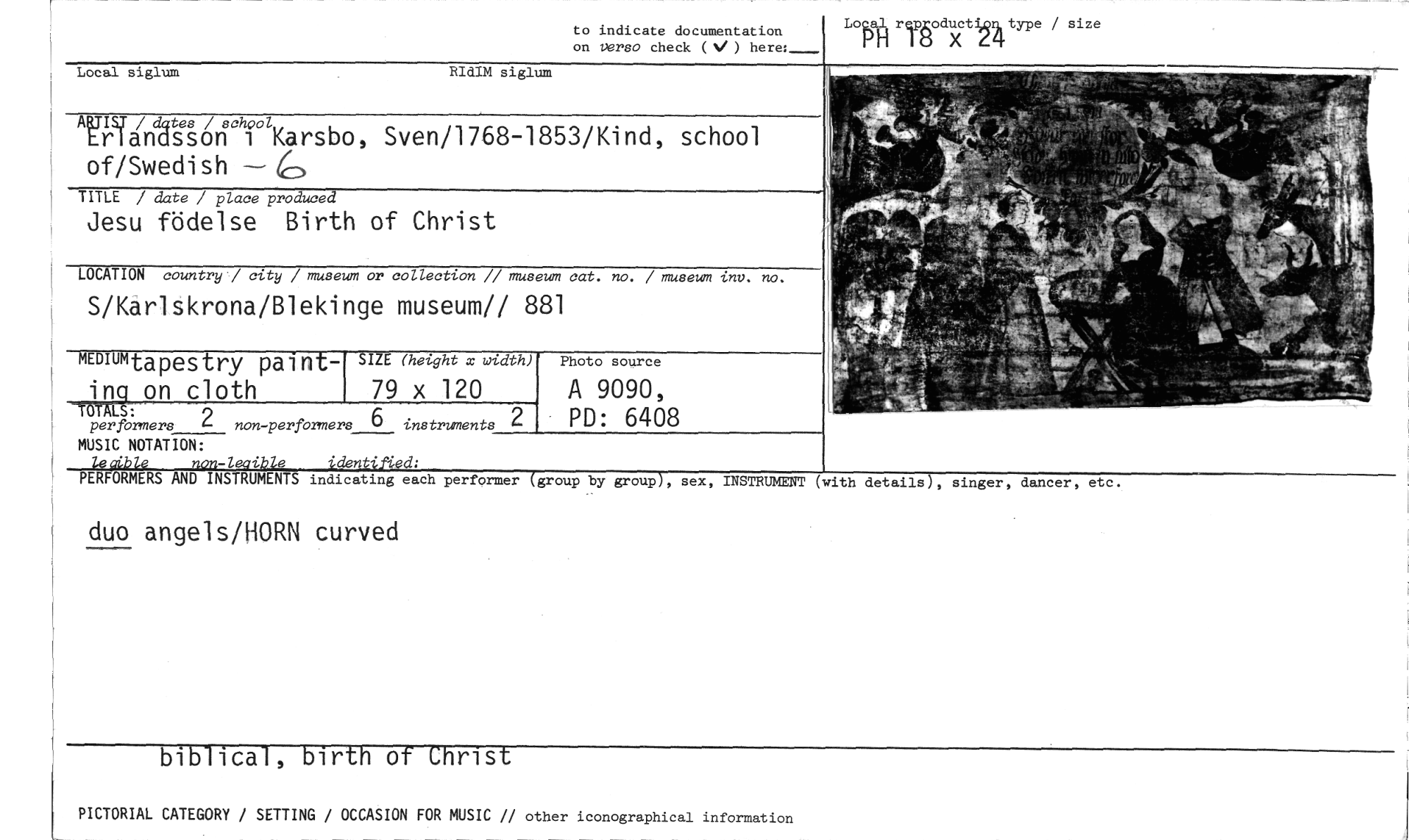 //// to indicate documentation //// on verso check (V ) here:- //// Logal renroductiontype / size //// PH Y8 x 24 //// AnsfåndägöricrKarsbo, Sven/1768-1853/Kind, school of/Swedish //// TITLE / date / place produced //// Jesu födelse Birth of Christ //// LOCATION country / city / museum or collection // museum cat. no. / museum inv. no. //// S/Karlskrona/Blekinge museum// 881 //// 14011ffita pestry paint- //// ing on cloth //// —MALS:- 2 2 //// perfbrmers non-performers 6 instruments //// Photo source //// A 9090, PD: 6408 //// SIZE (height x width) //// 79 x 120 //// MUSIC NOTATION: //// iealblenon-lecible identi4Yed: //// PERFORMERS AND INSTRUMENTS indicating each performer (group by group), sex, INSTRUMENT //// duo angels/HORN curved //// (with details), singer, dancer, etc. //// biblical, birth of Christ //// PICTORIAL CATEGORY / SETTING / OCCASION FOR MUSIC // other iconographical information ////