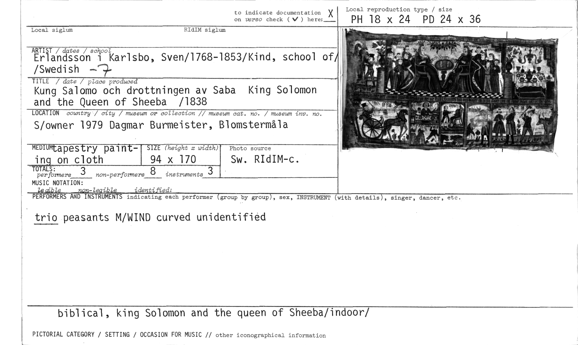 //// to indicate documentation X on verso check (V ) here: //// Local reproduction type / size //// PH 18 x 24 PD 24 x 36 //// Local siglum RIdIM siglum //// ARTIST / dates / school //// Erlandsson i Karlsbo, Sven/1768-1853/Kind, school o /Swedish //// TITLE / date / place produced //// Kung Salomo och drottningen av Saba King Solomon and the Queen of Sheeba /1838 //// LOCATION country / city / museum or collection // museum cat. no. / museum inv. no. //// S/owner 1979 Dagmar Burmeister, Blomstermåla //// MEDIUMt apestry painting on cloth //// TÖTALS: //// per formers 3 non-perfomners 8 instruments //// MUSIC NOTATION: //// non-/egibie 'denti ied: //// SIZE (height x width) //// 94 x 170 //// 3 //// Photo source //// Sw. RIdIM-c. //// PERFORMERS AND INSTRUMENTS indicating each performer group by group), sex, INSTRUMENT (with details), singer, dancer, etc. //// trio peasants M/WIND curved unidentifid //// biblical, king Solomon and the queen of Sheeba/indoor/ //// PICTORIAL CATEGORY / SETTING / OCCASION FOR MUSIC // other iconographical information ////