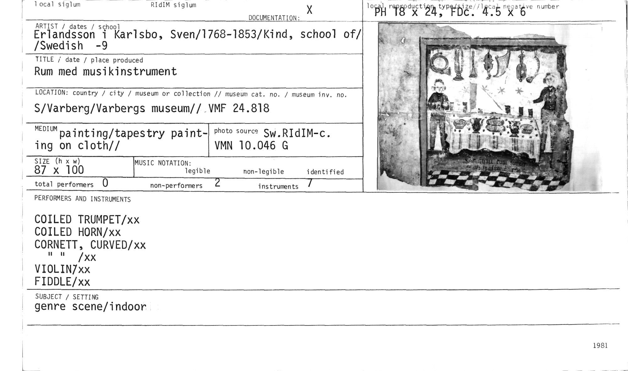 //// PERFORMERS AND INSTRUMENTS //// COILED TRUMPET/xx //// COILED HORN/xx //// CORNETT, CURVED/xx //// " " /xx VIOLIN7xx FIDDLE/xx //// SUBJECT / SETTING //// genre scene/indoor //// 1981 //// SIZE (h x w) //// 87 x 100 //// total performers 0 //// MUSIC NOTATION: //// legible non-legible i denti fi ed //// non-performers 2 instruments 7 //// 1 otal si glum //// RIdIM siglum //// DOCUMENTATION: //// 10 ramp dKti221. ,ypVtjide:,14cA nek:a tve nurober //// ARTIST / dates / school //// Erlandsson i Karlsbo, Sven/1768-1853/Kind, school of/ /Swedish -9 //// TITLE / date / place produced //// Rum med musikinstrument //// LOCATION: country / city / museum or collection // museum cat. no. / museum inv. no. //// S/Varberg/Varbergs museum// VMF 24.818 //// mu"painting/tapestry paint- ing on cloth// //// Ph°t° "ur"- Sw.RIdIM-c. VMN 10.046 G ////