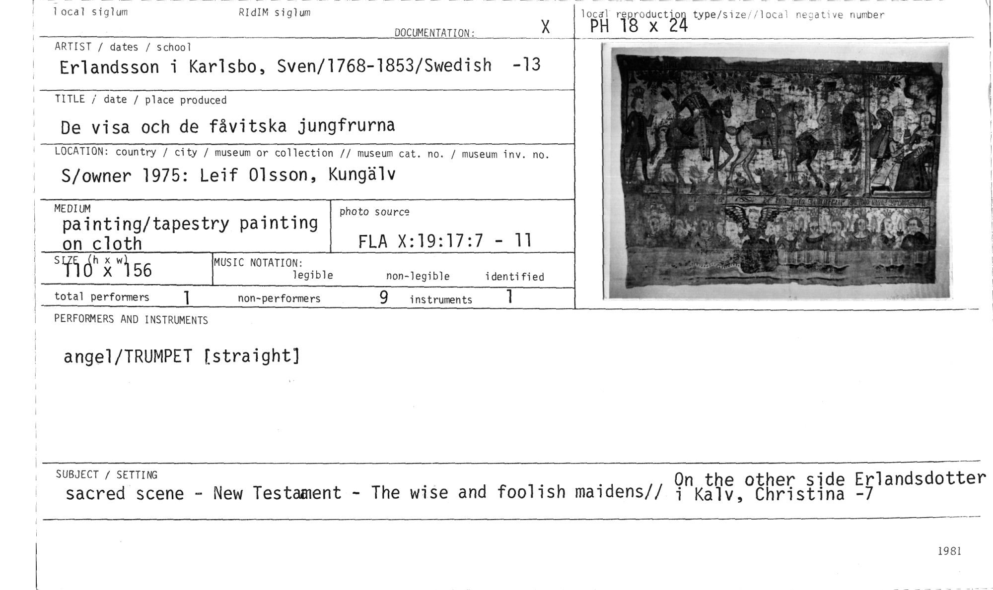 //// PERFORMERS AND INSTRUMENTS //// angel/TRUMPET [straight] //// SUBJECT / SETTING On the other side Erlandsdotter //// sacred scene - New Testament - The wise and foolish maidens// i Kalv, Christina -7 //// RIdIM siglum //// 1 ocal siglum //// DOCUMENTATION: //// X //// local eproduction18 type/size/ilocei reatve number //// PH x 24 //// ARTIST / dates / school //// Erlandsson i Karlsbo, Sven/1768-1853/Swedish -13 //// TITLE / date / place produced //// De visa och de fåvitska jungfrurna //// LOCATION: country / city / museum or collection // museum cat. no. / museum inv. no. //// S/owner 1975: Leif Olsson, Kungälv //// MEDIUM //// painting/tapestry painting on cloth //// photo source //// FLA X:19:17:7 - 11 //// 4 - Atif //// Iter_y 5-A.N //// ,a(rJr7mt- '154 //// suE _N x wi 110 x 156 //// MUSIC NOTATION: //// legible //// non-legible identified //// total performers //// non-performers //// instruments 1 //// 1 //// 1981 ////
