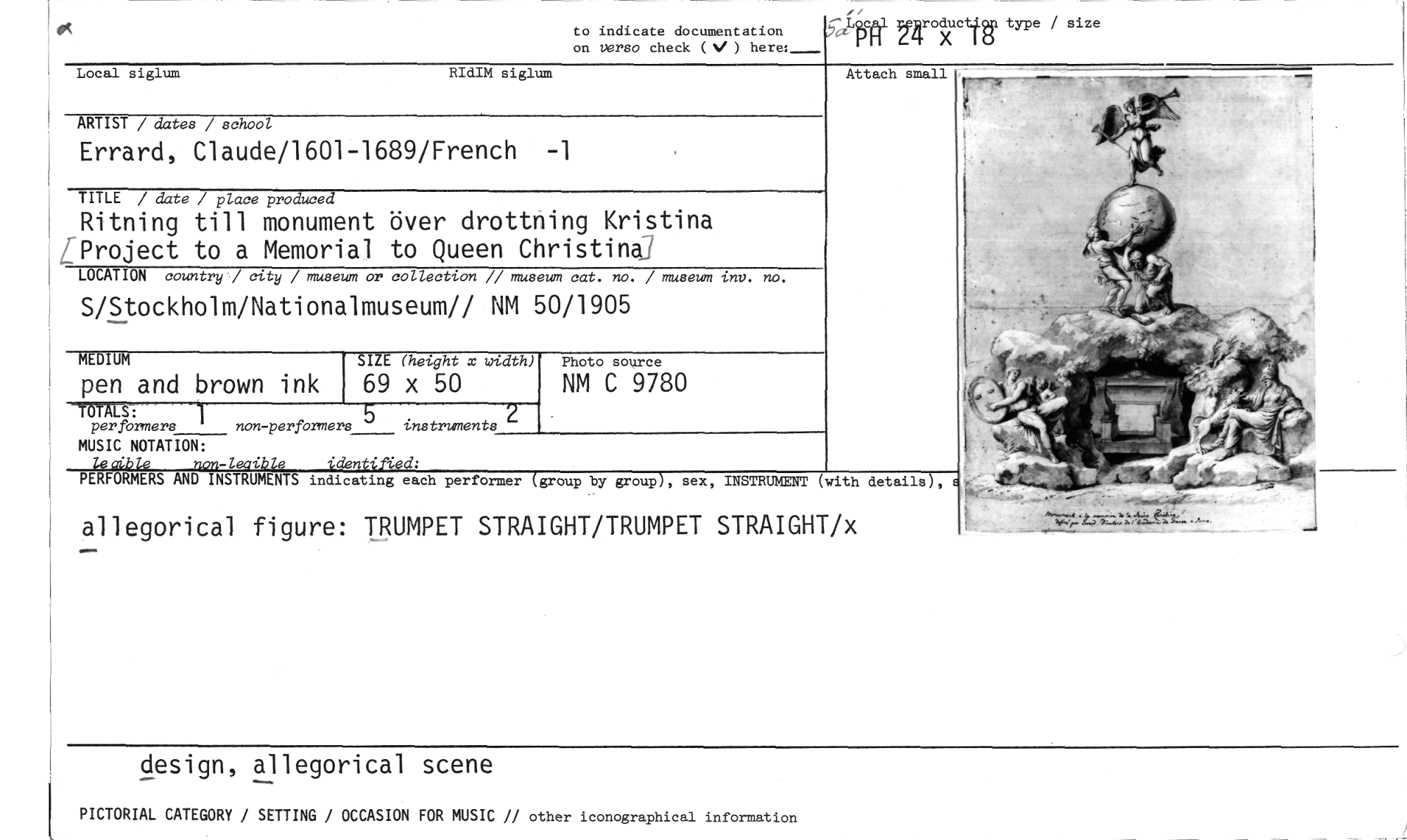 //// to indicate documentation ,5-J.Lpn'T Pfliroduct.j.ä1 type / size //// on verso check (N.1 ) here: L4 I //// Local siglum RIdIM siglum //// Attach small //// - //// ..#71,31k //// ARTIST / dater / school //// Errard, Claude/1601-1689/French -1 //// TITLE / date / place produced //// Ritning till monument över drottning Kristina /Project to a Memorial to Queen Christina] //// LOCATION country / city / museum or collection // museum cat. no. / museum inv. no. //// S/Stockholm/Nationalmuseum// NM 50/1905 //// SIZE (height x width) //// 69 x 50 //// MUSIC NOTATION: //// non-leaible ident-41Yed: //// PERFORMERS AND INSTRUMENTS indicating each performer (group by group), sex, INSTRUMENT //// allegorical figure: TRUMPET STRAIGHT/TRUMPET STRAIGHT/x //// TÖTALS: //// per forners 1non-performers instruments //// MEDIUM //// pen and brown ink //// Photo source //// NM C 9780 //// (with details), E //// design, allegorical scene //// PICTORIAL CATEGORY / SETTING / OCCASION FOR MUSIC // other iconographical information ////