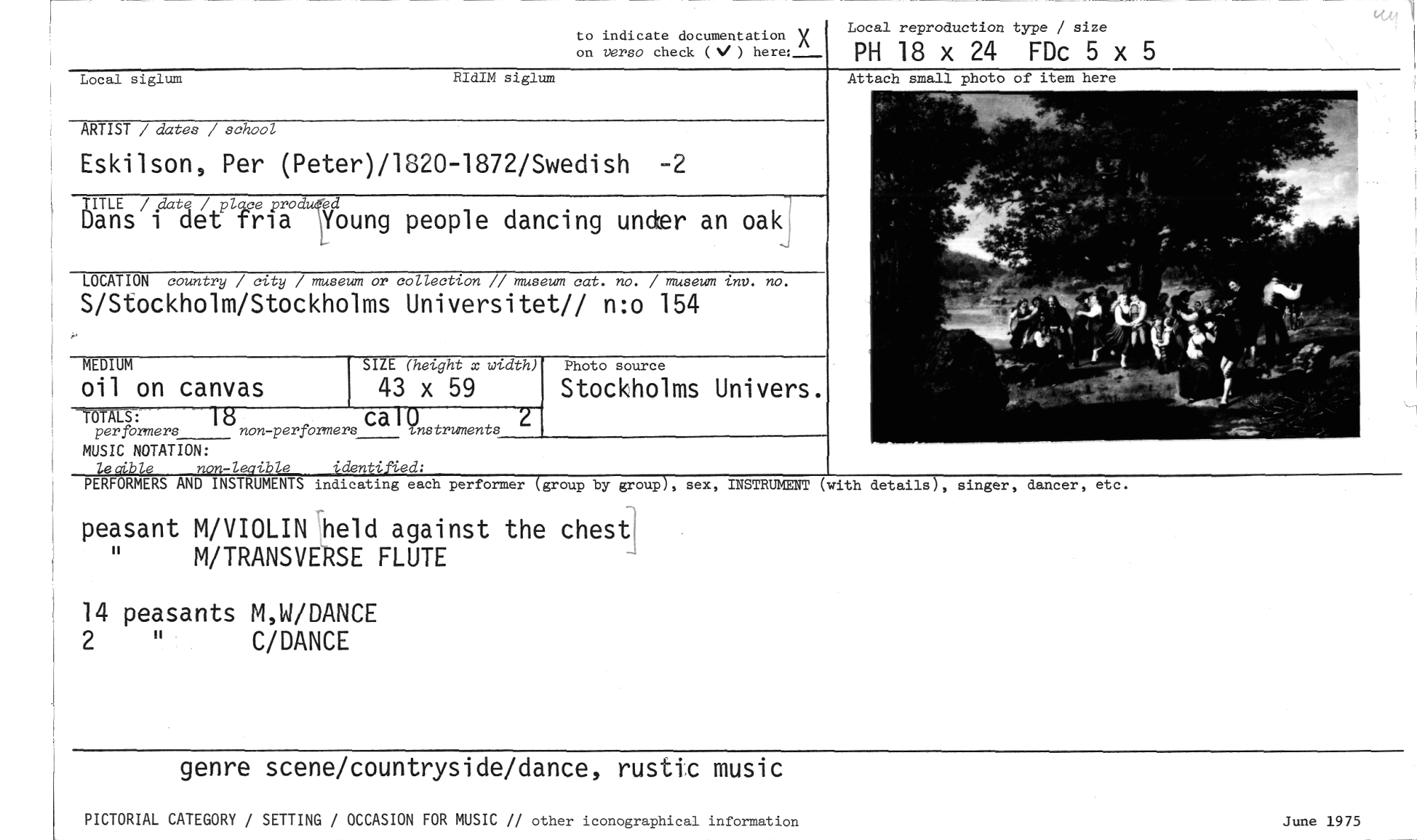 //// peasant M/VIOLIN held against the chest " M/TRANSVERSE FLUTE //// 14 peasants M,W/DANCE 2 " C/DANCE //// genre scene/countryside/dance, rustic music //// PICTORIAL CATEGORY / SETTING / OCCASION FOR MUSIC // other iconographical information June 1975 //// to indicate documentation X on verso check ) here:_ //// Local siglum RIdIM siglum //// ARTIST / dates / school //// Eskilson, Per (Peter)/1820-1872/Swedish -2 //// Dans/ date / plcue prodged Dans i det fria ''Young people dancing under an oak //// LOCATION country / city / museum or collection // museum cat. no. / museum inv. no. //// S/Stockholm/Stockholms Universitet// n:o 154 //// Local reproduction type / size //// PH 18 x 24 FDc 5 x //// MEDIUM //// oil on canvas //// SIZE (height x width) //// 43 x 59 //// Photo source //// Stockholms Univers. //// OTALS:per formers 18non-performer:7(55471 instruments //// MUSIC NOTATION: //// tecible non-leaible identified: //// PERFORMERS AND INSTRUMENTS //// sex, INSTRUMENT (with details), singer, dancer, etc. //// 2 //// indicating each performer (group by group), //// Attac ////