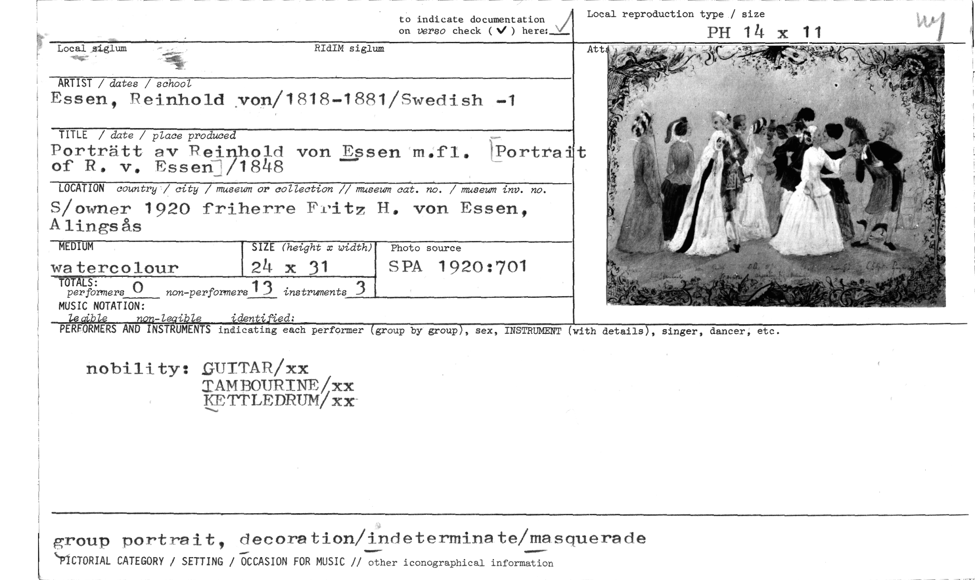 //// nobility: DUTTAR/xx //// TAMBOURINE/,xx //// KETTLEDRITM/xx //// group portrait, decoration/indeterminate/masquerade //// `TUTORIAL CATEGORY / SETTING / OCCASION FOR MUSIC // other iconographical information //// to indicate documentation on verso check ( ) //// Local siglum RIdIM siglum //// ARTIST / dates / school //// Essen, Reinhold von/1818-1881/Swedish -1 //// Local reproduction type / size //// PH 14 x 11 //// TITLE / date / place produced //// Porträtt av Reinhold von Essen m.fl.'Portratt of R. v, Essen /1848 //// LOCATION country / city / museum or collection // museum cat. no. / museum tnv. no. //// S/owner 1920 friherre Fritz H. von Essen, Alingsås //// SIZE (hetght x width) //// 24 x 31 //// Photo source //// SPA 1920:701 //// TOTALS: eN //// performers non-performers 1 3 instruments 3 //// MUSIC NOTATION: //// lealble non-legible 1,dentified: //// PERFORMERS AND INSTRUMENTS //// (group by group), sex, INSTRUMENT (with details), singer, dancer, etc. //// indicating each performer //// MEDIUM //// wa tercolour ////