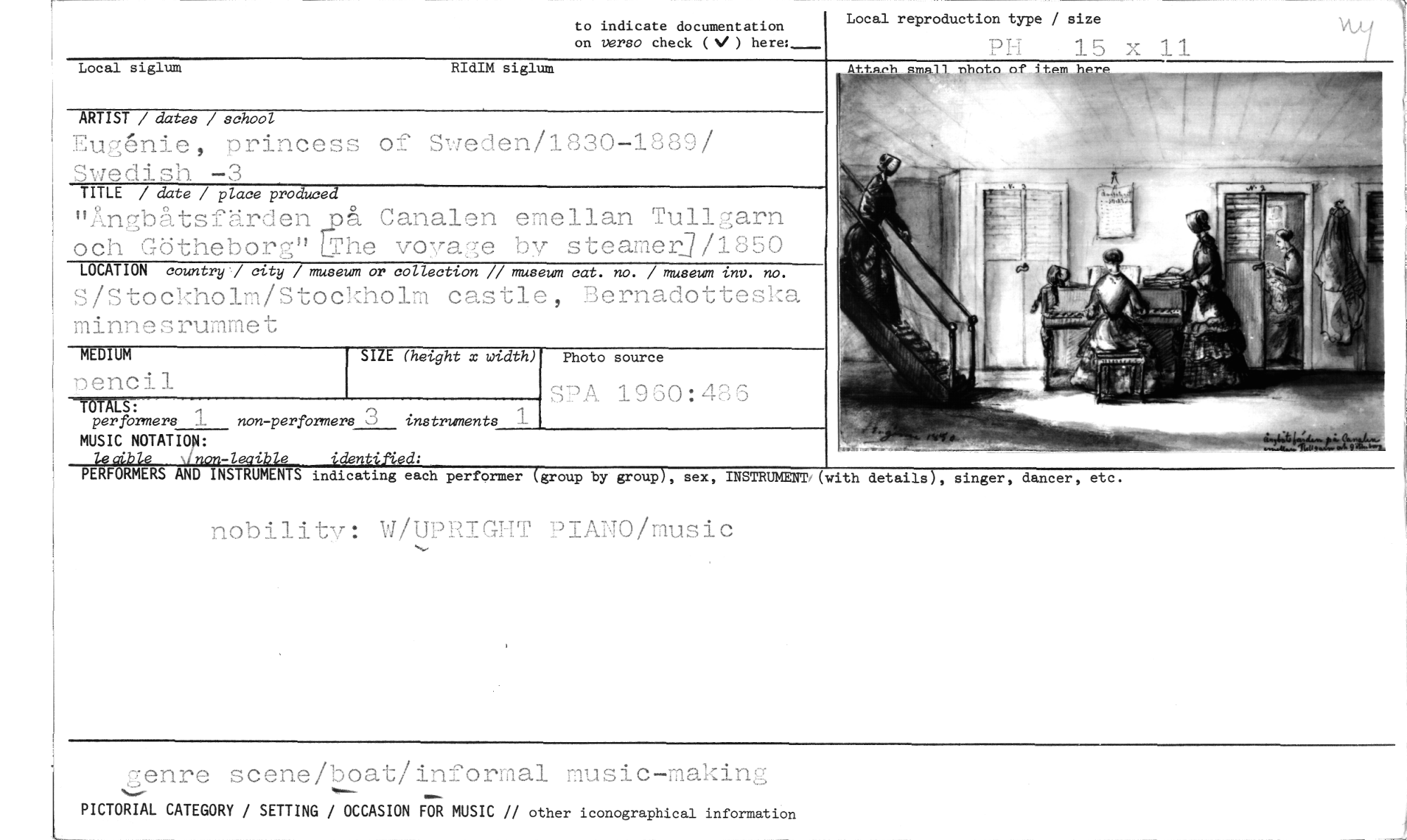 //// Local siglum //// RIdIM siglum //// group), sex, INSTRUMENT/(with //// details), singer, dancer, etc. //// to indicate documentation //// on verso check (V ) here:___ //// ARTIST / dates / school //// Eug6nie, princess of Sweden/1830-1889/ Swedish -3 //// TITLE / date / place produced //// "Angbätsfärden,på Canalen emellan Tullgarn och Götheborgu [The voyar,,,e by steamed/1850 //// LOCATION country / city / museum or collection // museum cat. no. / museum inv. no. //// S/Stockholm/Stockholm castle, Bernadottesim minnesrummet //// SIZE (height x width) //// TOTALS: //// per forners 1 non-performers J instruments 1 //// MUSIC NOTATION: //// 194i,ble non-leaible identified: //// PERFORMERS AND INSTRUMENTS indicating each performer (group by //// nobility: W/UPRIGJ-IT PIANO/music //// genre scene/boat/informal music-making //// «.- //// PICTORIAL CATEGORY / SETTING / OCCASION FOR MUSIC // other iconographical information //// MEDIUM //// nencil //// Local reproduction type / size //// PI` 15 x 11 //// Photo source //// SPA 1960:486 ////