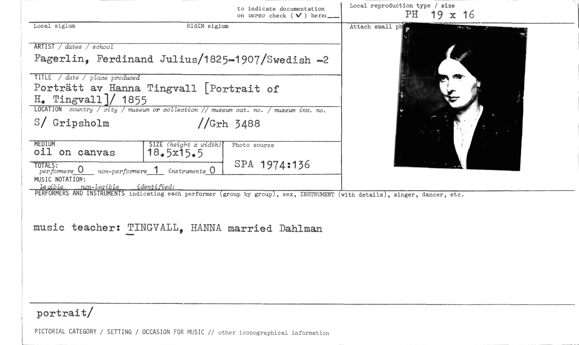//// portrait //// PICTORIAL CATEGORY / SETTING / OCCASION FOR MUSIC // other iconographical information //// Local siglum RIdIM siglum //// Attach small //// P //// Photo source //// SIZE (hevght x width) //// 18.5x15.5 //// oil on canvas //// MEDIUM //// PERFORMERS AND INSTRUMENTS indicating each performer (group by group), sex, INSTRUMENT (with details), singer, //// music teacher: TINGVALL, HANNA married Dahlman //// dancer, //// et //// to indicate documentation //// on verso check (V ) here:_ //// Local reproduction type / size //// PH 19 x 16 //// ARTIST / dates / school //// Fagerlin, Ferdinand Julius/1825-1907/Swedish —2 //// TITLE / date / place produced //// Porträtt av Hanna Tingvall [Portrait of //// H. Tingvall]/ 1855 //// LOCATION country / city / museum or collection // museum cat. no. / museum inv. no. //// S/ Gripsholm //Grh 3488 //// -TUMS: //// per formers 0 non-performers 1 instruments 0 //// MUSIC NOTATION: //// non-leaible identified: //// SPA 1974:136 ////