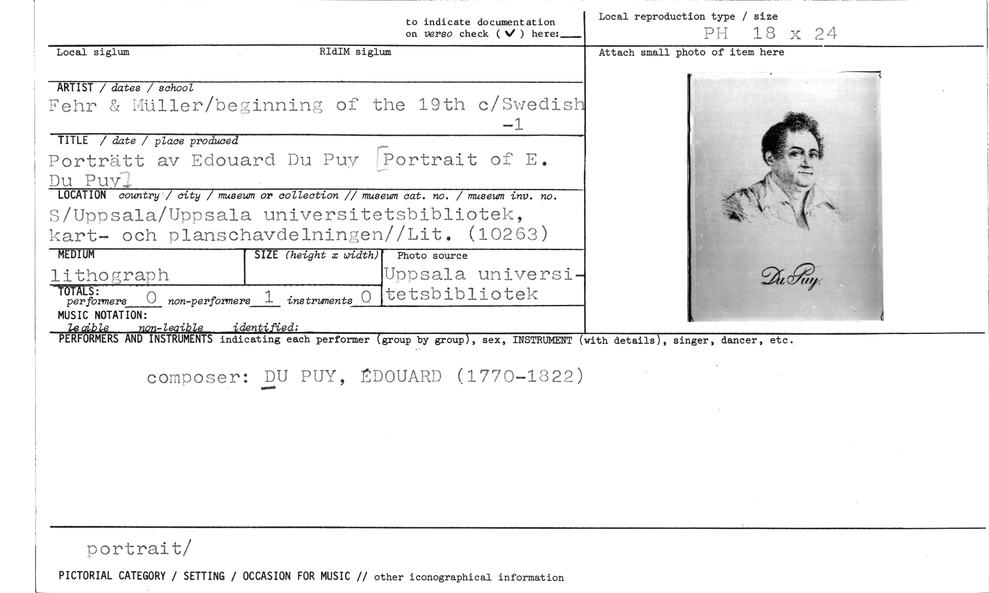 //// to indicate documentation //// on verso check ( ) here:_ //// Local reproduction type / size //// PH 18 x 24 //// Local siglum RIdIM siglum //// ARTIST / dates / school //// Fehr MUller/beginning of the 19th c/Swedish //// -1 //// TITLE / date / place produced //// Porträtt av Edouard Du Puv Portrait of E. Du Puv: //// LOCATION country / city / museum or collection // museum cat. no. / museum Inv. no. //// S/Uppsala/Uppsala universitetsbibliotek, kart- och planschavdelningen//Lit. (10263) //// MEDIUM SIZE (height x width) Photo source //// lithograph Uppsala universi- //// per formers 0 non-performers 1 0 tetsbibliotek //// Attach small photo of item here //// MUSIC NOTATION: //// leaible non-leaible identified; //// PERFORMERS AND INSTRUMENTS indicating each performer (group by group), sex, INSTRUMENT //// (with details), singer, dancer, etc. //// composer: DU PUY, nDOUARD (1770-1822) //// portrait/ //// PICTORIAL CATEGORY / SETTING / OCCASION FOR MUSIC // other iconographical information ////