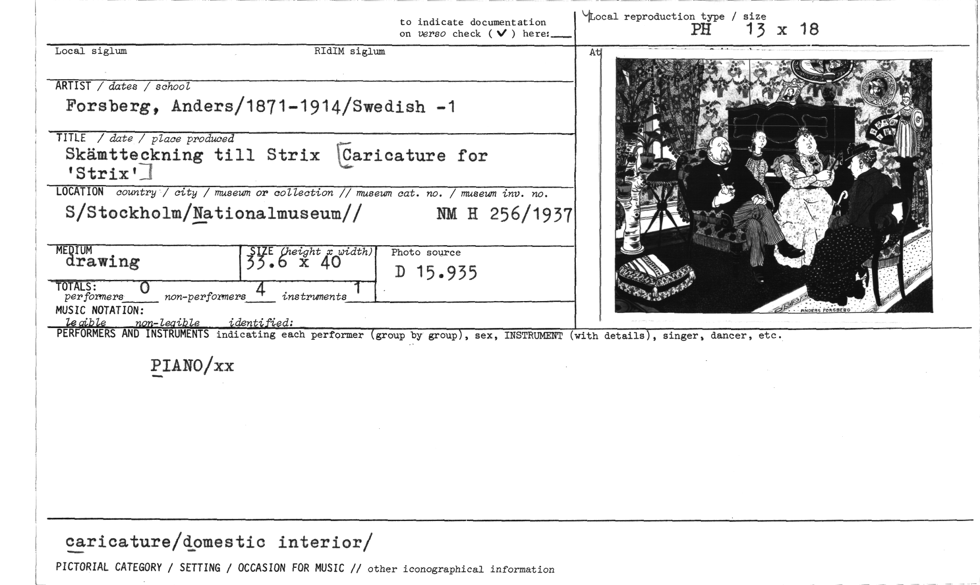 //// to indicate documentation //// on verso check (%, ) here: .--- //// Local reproduction type / size //// PH 13 x 18 //// Local siglum RIdIM siglum //// ARTIST / dates / school //// Forsberg, Anders/1871-1914/Swedish -1 //// TITLE / date / place produced //// Skämtteckning till Strix @aricature for 'Strixt3 //// LOCATION country / city / museum or collection // museum cat. no. / museum Inv. no. //// S/Stockholm/Nationalmuseumll NM H 256/1937 //// MEQIUM //// drawing //// LS: //// per formers non-performers instruments //// MUSIC NOTATION: //// le aible non-leaible identified: //// gE åhozsgcht lowvdth) //// Photo source //// D 15.935 //// PERFORMERS AND INSTRUMENTS indicating each performer (group by group), sex, INSTRUMENT (with details), singer, dancer, etc. //// PIANO/xx //// caricature/domestic interior/ //// --- //// PICTORIAL CATEGORY / SETTING / OCCASION FOR MUSIC // other iconographical information ////