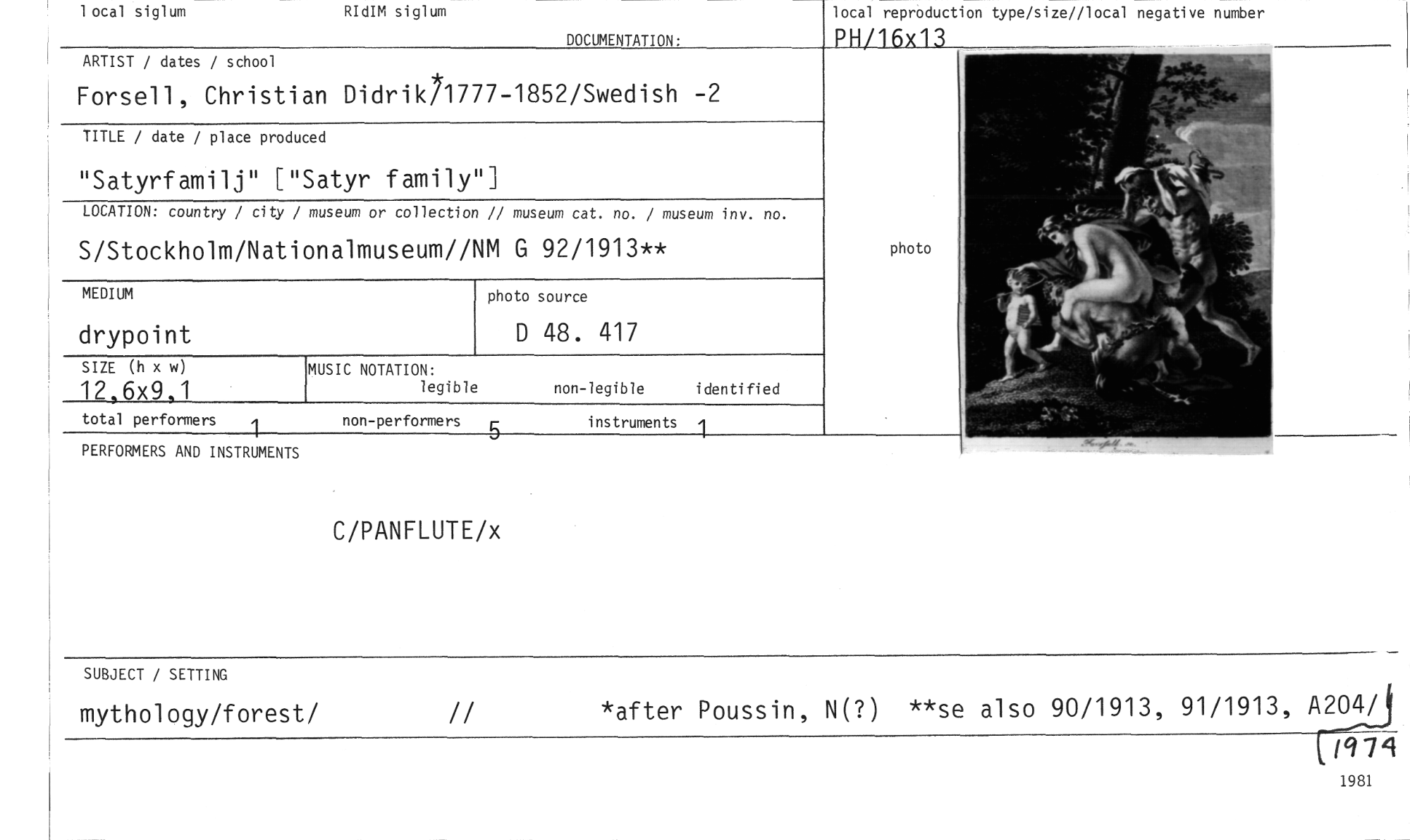 //// 1 ocal siglum RIdIM siglum //// local reproduction type/size//local negative number //// P //// H/16x13 //// photo //// ARTIST / dates / school //// Forsell, Christi //// TITLE / date / place produ ed //// "Satyrfamilj" [" Satyr family"] //// LOCATION: country / city / //// S/Stockholm/Nati //// MEDIUM //// drypoint //// SIZE (h x w) //// 12,6x9..1 //// total performers //// PERFORMERS AND INSTRUMENTS //// DOCUMENTATION: //// non-legible identified //// instruments 1 //// MUSIC NOTATION: //// legible //// 1 //// non-performers //// 5 //// an Didrik71777-1852/Swedish -2 //// museum or collection // museum cat. no. / museum inv. no. //// onalmuseum//NM G 92/1913** //// photo source //// D 48. 417 //// C/PANFLUTE/x //// SUBJECT / SETTING //// mythology/forest/ // *after Poussin, N(?) **se allo 90/1913, 91/1913, A204/ //// IR 71 //// 1981 ////