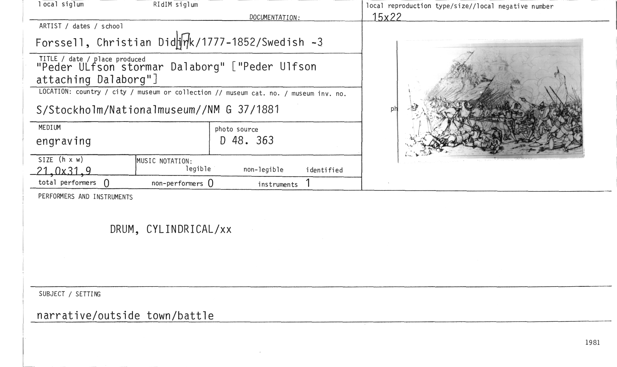 //// 1 ocal siglum //// RIdIM siglum //// DOCUMENTATION: //// local reproduction type/size//local negative number //// 15x22 //// ARTIST / dates / school //// Forssell, Christian Did k/1777-1852/Swedish -3 //// TITLE / date / place produced //// "Peder Ulfson stormar Dalaborg" ["Peder Ulfson attaching Dalaborg") //// LOCATION: country / city / museum or collection // museum cat. no. / museum inv. no. //// S/Stockholm/Nationalmuseum//NM G 37/1881 //// photo source //// D 48. 363 //// SIZE (h x w) //// 21,0x31,9 //// total performers non-performers 0 instruments 1 //// MEDIUM //// engraving //// MUSIC NOTATION: //// legible non-legible identified //// PERFORMERS AND INSTRUMENTS //// DRUM, CYLINDRICAL/xx //// SUBJECT / SETTING //// narrative/outside town/battle //// 1981 ////