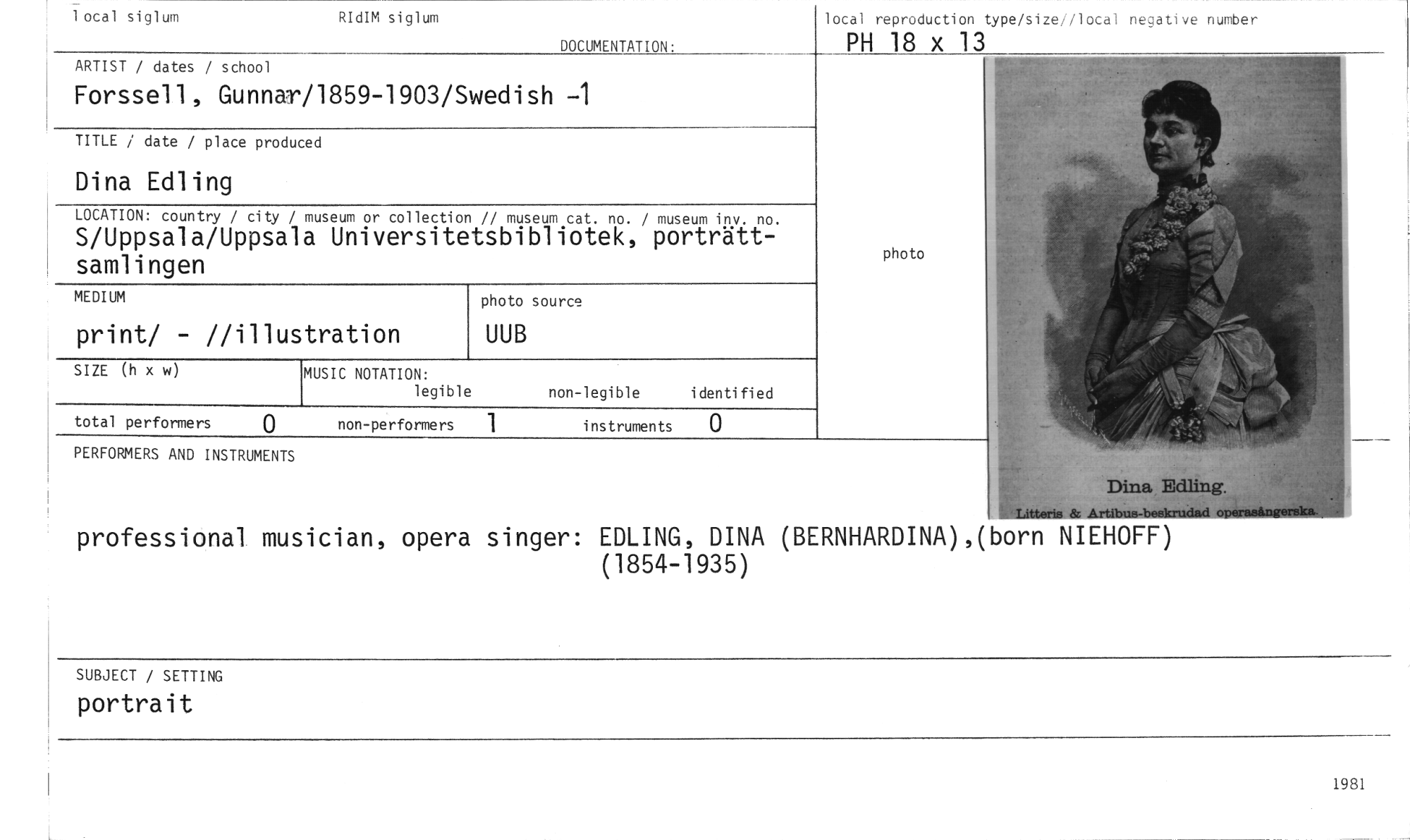 //// 1 ocal siglum RIdIM siglum //// DOCUMENTATION. //// ARTIST / dates / school //// Forssell, Gunnar /1859-1903/Swedish -1 //// TITLE / date / place produ ced //// Dina Edling //// LOCATION: country / city / //// S/Uppsala/Uppsal a Universitetsbibliotek, porträtt- //// museum or collection // museum cat. no. / museum inv. no. //// samlingen //// MEDIUM //// print/ - //illus tration //// SIZE (h x w) //// non-legible identified //// total performers 0 non-performers 1 instruments 0 //// PERFORMERS AND INSTRUMENTS //// Dina Edling. //// Litteris & Artibus-beekrudad operasångerBka //// professional musician, opera singer: EDLING, DINA (BERNHARDINA),(born NIEHOFF) //// (1854-1935) //// local reproduction type/size//local negative numer //// PH 18 x 13 //// photo //// MUSIC NOTATION: //// legible //// photo source //// UUB //// 11111F-r //// SUBJECT / SETTING //// portrait //// 1981 ////