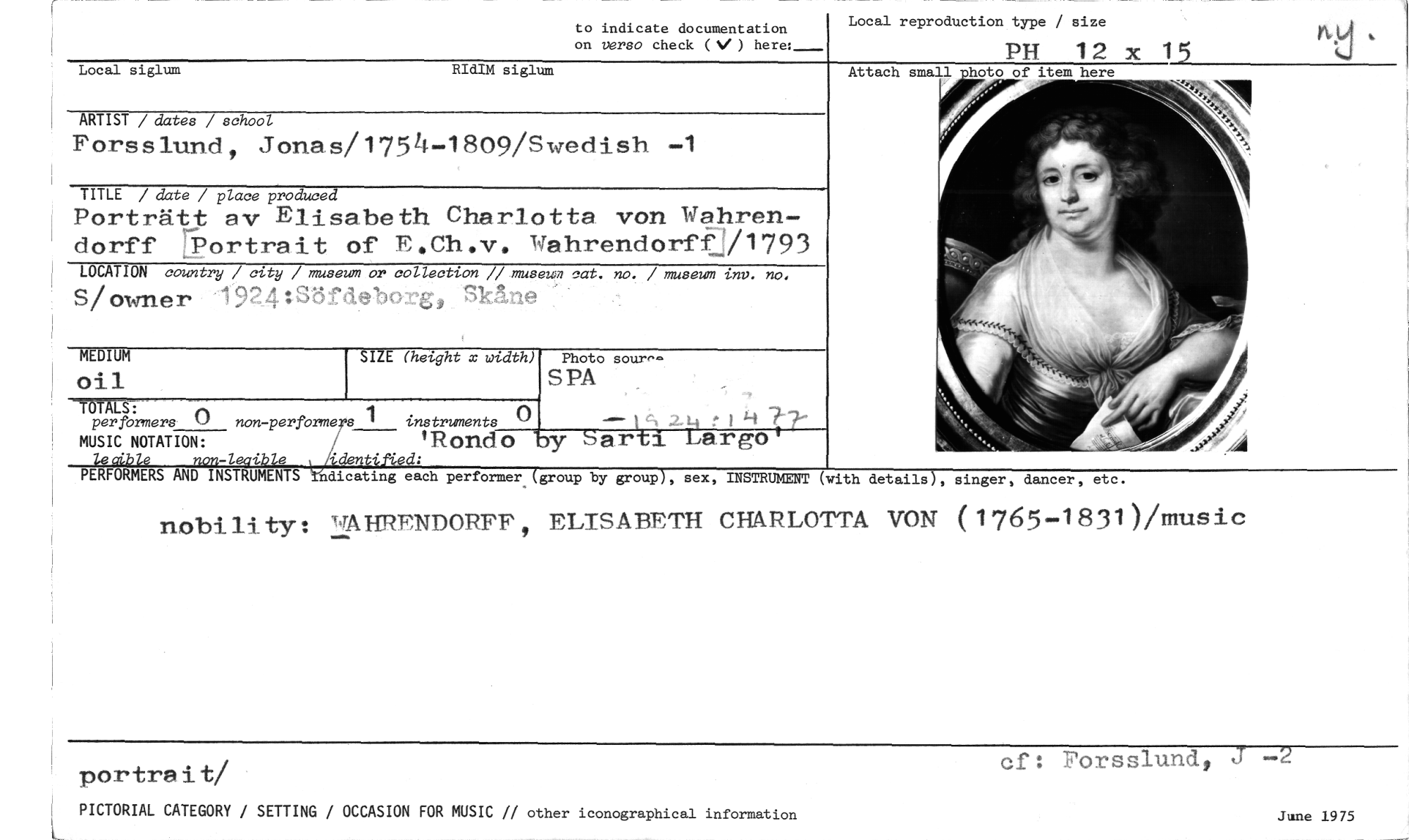 //// Local reproduction type / size //// PH 12 x //// Attach small //// to indicate documentation on verso check ( V ) //// Local siglum RIdIM siglum //// ARTIST / dates / school //// Forsslund, Jonas/1754-1809/Swedish -1 //// TITLE / date / place produced //// Porträtt av Elisabeth Charlotta von Wahren- //// dorff Portrait of F,Ch.v. Wahrendorff /1793 //// LOCATION country / city / museum or collection // museum cat. no. / museum inv. no //// Siowner 1924:Sördebol:zi Såne //// MEDIUM SIZE (height x width) //// oil //// TOTALS: //// perfbrmers () non-perfbrmers 1 instruments 1 //// MUSIC NOTATION: 'Rondo y sar'tx Largo //// ledble non-leaible yidentified: //// PERFORMERS AND INSTRUMENTS ndicating each performer (group by groupj, sex, INSTRUMENT (with details), singer, dancer, etc. //// nobi li_ ty :l'TAHRF,NDORFF 9 ELISABETH CHARLOTTA VON ( 1765-1831 )/fflus i c //// Photo SOUT //// S PA //// portrait/ //// PICTORIAL CATEGORY / SETTING / OCCASION FOR MUSIC // other iconographical information Jane 1975 //// cf: Forsslund, J -2 ////