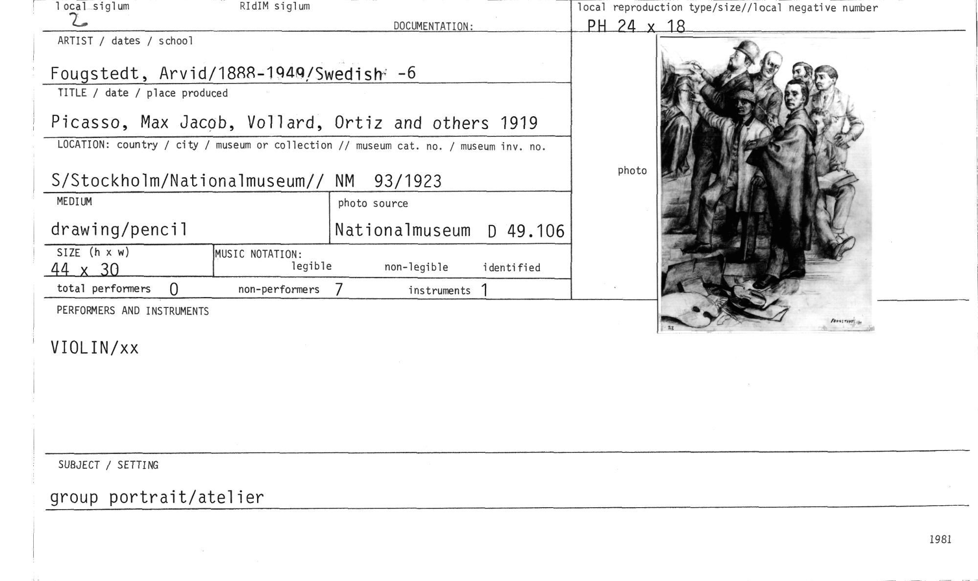 //// instruments 1 //// total performers 0 non-performers 7 //// MUSIC NOTATION: //// legible //// non-legible identified //// local reproduction type/size//local negative number //// PH 24 x 18 //// DOCUMENTATION: //// ARTIST / dates / school //// Fougstedt, Arvid/18RR-1949/Swedish - //// TITLE / date / place produced //// Picasso, Max Jacob, Vollard, Ortiz and others 1919 //// LOCATION: country / city / museum or collection // museum cat. no. / museum inv. no. //// S/Stockholm/Nationalmuseum// NM 93/1923 //// MEDIUM //// drawing/pencil //// SIZE (h x w) //// 44 x 30 //// PERFORMERS AND INSTRUMENTS //// VIOLIN/xx //// photo //// SUBJECT / SETTING //// group portrait/atelier //// 1981 //// RIdIM siglum //// 1 ocal siglum //// photo source //// Nationalmuseum D 49.106 ////