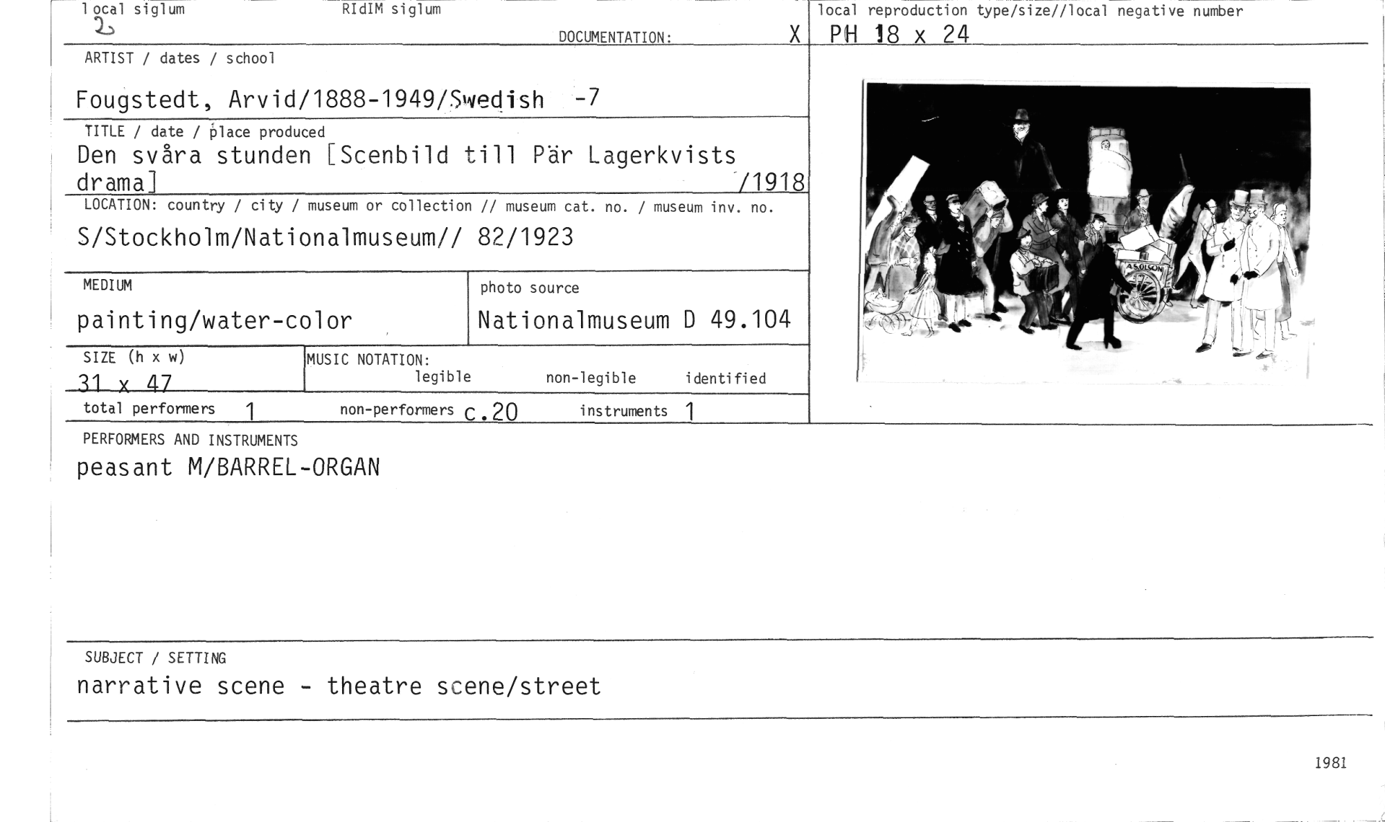 //// PERFORMERS AND INSTRUMENTS //// peasant M/BARREL-ORGAN //// SUBJECT / SETTING //// narrative scene - theatre scene/street //// 1 ocal siglum //// RIdIM siglum //// DOCUMENTATION: //// local reproduction type/size//local negative number //// PH 18 x 24 //// ARTIST / dates / school //// Fougstedt, Arvid/1888-1949/Swedish //// TITLE / date / place produced //// Den svåra stunden [Scenbild till Pär Lagerkvists //// drama] 71918 //// LOCATION: country / city / museum or collection // museum cat. no. / museum inv. no. //// S/Stockholm/Nationalmuseum// 82/1923 //// MEDIUM //// painting/water-color //// photo source //// Nationalmuseum D 49.104 //// SIZE (h x w) //// M Y 4.7 //// MUSIC NOTATION: //// legible //// non-legible i denti fi ed //// total performers 1 //// non-performers c 20 instruments 1 //// 1981 ////