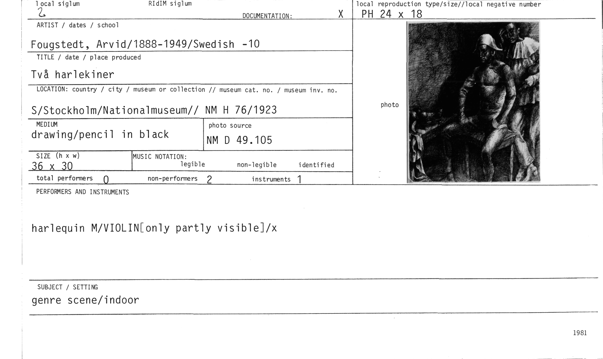 //// 1 ocal siglum //// RIdIM siglum //// DOCUMENTATION. //// local reproduction type/size//local negative number //// PH 24 x 18 //// ARTIST / dates / school //// Fougstedt, Arvid/1888-1949/Swedish -10 //// TITLE / date / place produced //// Två harlekiner //// LOCATION: country / city / museum or collection // museum cat. no. / museum inv. no. //// S/Stockholm/Nationalmuseum// NM H 76/1923 //// MEDIUM //// drawing/pencil in black //// MUSIC NOTATION: //// legible non-legible identified //// total performers non-performers 2 instruments 1 //// PERFORMERS AND INSTRUMENTS //// photo //// SIZE (h x w) //// 36 x 30 //// photo source //// NM D 49.105 //// harlequin M/VIOLIN[only partly visiblel/x //// SUBJECT / SETTING //// genre scene/indoor //// 1981 ////