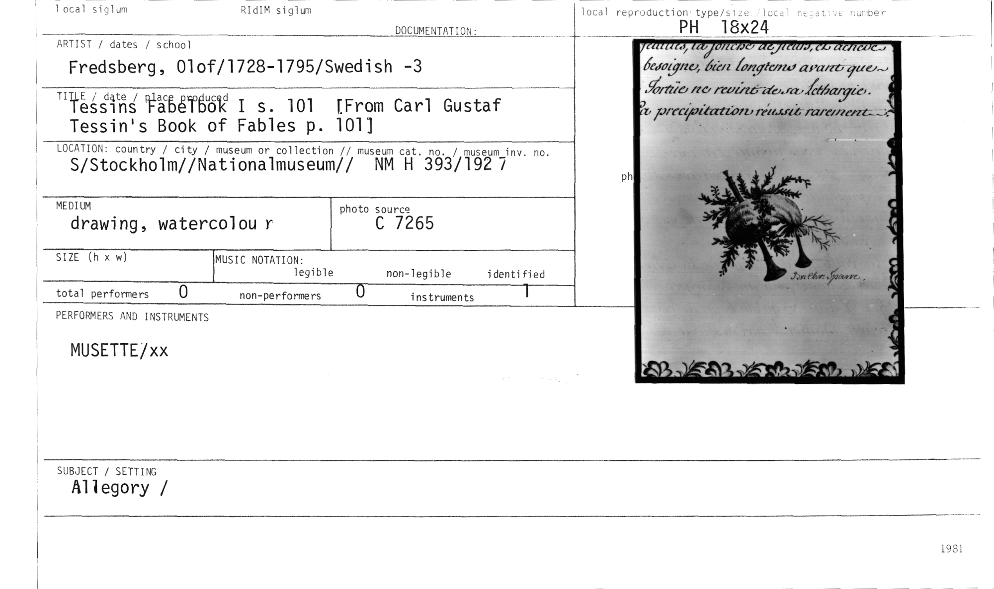 //// local siglum RIdIM siglum //// DOCUMENTATION: //// local reproduction type/, //// PH 18x24 //// ph //// ARTIST / dates / school //// Fredsberg, Olof/1728-1795/Swedish -3 //// TI e 1^91 fStAitök' I s. 101 [From Carl Gustaf //// Tessin's Book of Fables p. 101] //// LOCATION: country / city / museum or collection // museum cat. no. / museum inv. no. //// S/Stockholm//Nationalmuseum// NM H 393/1927 //// MEDIUM //// drawing, watercolou r //// MUSIC NOTATION: //// legible non-legible i denti fi ed ft?((UCJ, I /011CiJC, , CR, arneue, 9 //// 6410(9'. IM; 5k/1 langlentO aparrb //// golitio reviabr-de,ra.,Aikvy&,. //// /rectp. raremewtt---. //// SIZE (h x w) //// photo source //// C 7265 //// 1 //// total performers 0 //// non-performers instruments //// PERFORMERS AND INSTRUMENTS //// MUSETTE/xx //// SUBJECT / SETTING //// Allegory / //// 1 //// 11267',' ////