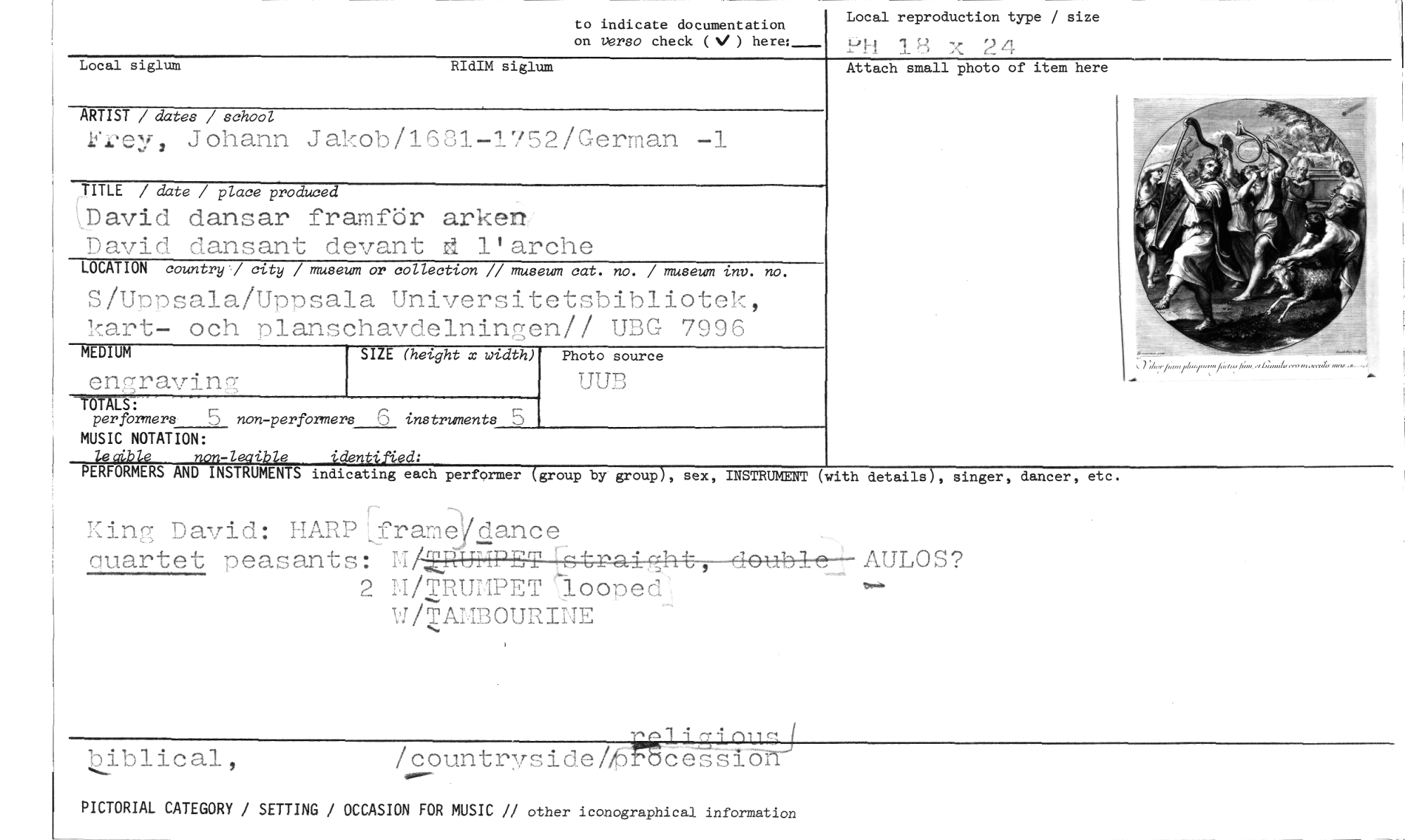 //// to indicate documentation //// on vem° check ( ) here:__-- //// Local reproduction type / size 1-14 Vix 24 //// Local siglum RIdIM siglum //// ARTIST / datas / school //// k'rey, Johann Jakob/1631-1752/German -1 //// TULE / date / place produced //// \David dansar framför arken David dansant devant d l'arche //// LOCATION country" city / museum or collection // museum cat. no. / museum inv. no. //// S/Uppsala/Uppsala Universitetsbibliotek, hart- och planschavdelningen// UBG 7996 //// Attach small photo of item here //// MEDIUM //// engraving //// SIZE (hetght x brulth) //// Photo source //// UUB //// -TÖTÅLS: //// per formers 5 non-performera 6 instruments 5 //// MUSIC NOTATION: //// Zed.ble non-leaile identified: //// PERFORMERS AND INSTRUMENTS indicating each performer //// (group by group), sex, INSTRUMENT (with details), singer, dancer, etc. //// King David: HARPJrame dance auartet peasants: M AULOS? //// 2 II/TRUI!IPET looned ,- //// Wa.AMBOURINE //// //// biblical, /countryside/h cesslo //// •^• //// PICTORIAL CATEGORY / SETTING / OCCASION FOR MUSIC // other iconographical information ////