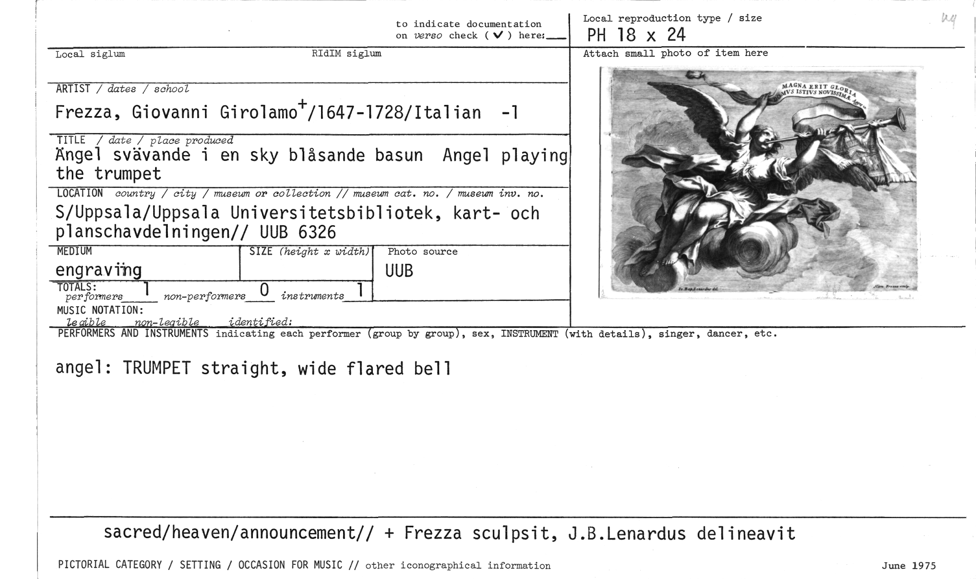 //// to indicate documentation on verso check (N/ ) here; //// Local reproduction type / size //// PH 18 x 24 //// Local siglum RIdIM siglum Attach small photo of item here //// ARTIST / dates / school //// Frezza, Giovanni Girolamo+/1647-1728/Italian //// TITLE / date / place produced //// Ängel svävande i en sky blåsande basun Angel playing the trumpet //// LOCATION country / city / museum or collection // museum cat. no. / museum inv. no. //// S/Uppsala/Uppsala Universitetsbibliotek, kart- och planschavdelningen// UUB 6326 //// SIZE (height x width) //// TALS: 1 //// per formers non-perfbrmers ° instruments //// MUSIC NOTATION: //// 4soibie non-leoible fcdentified: //// MEDIUM //// engravitig //// Photo source //// UUB //// PERFORMERS AND INSTRUMENTS indicating each performer (group by group), sex, INSTRUMENT (with details), singer, dancer, etc. //// angel: TRUMPET straight, wide flared bell //// sacred/heaven/announcement// + Frezza sculpsit, J.B.Lenardus delineavit //// PICTORIAL CATEGORY / SETTING / OCCASION FOR MUSIC // other iconographical information June 1975 ////
