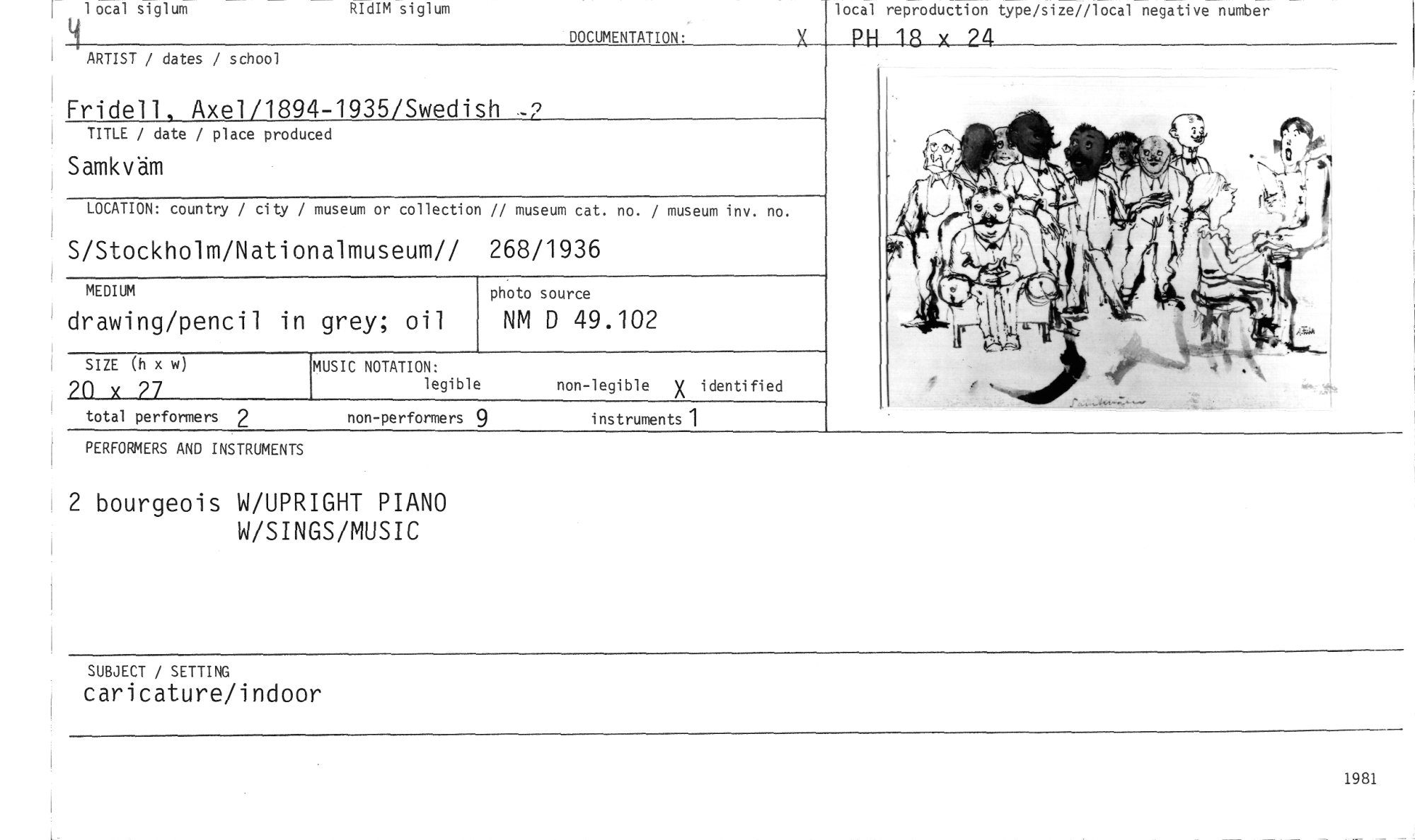 //// 1 ocal siglum RIdIM siglum //// ARTIST / dates / school //// DOCUMENTATION. //// local reproduction type/size//local negative number //// RH 18 x 24 //// Fridell, Axel/1894-1935/Swedish //// TITLE / date / place produced //// Samkväm //// LOCATION: country / city / museum or collection // museum cat. no. / museum inv. no. //// S/Stockholm/Nationalmuseum// 268/1936 //// photo source //// NM D 49.102 //// MUSIC NOTATION: //// legible non-legible xidentified //// MEDIUM //// drawing/pencil in grey; oil //// SIZE (h x w) //// 70 x 27 //// total performers 2 non-performers 9 instruments 1 //// PERFORMERS AND INSTRUMENTS //// 2 bourgeois W/UPRIGHT PIANO //// W/SINGS/MUSIC //// SUBJECT / SETTING //// caricature/indoor //// 1981 ////