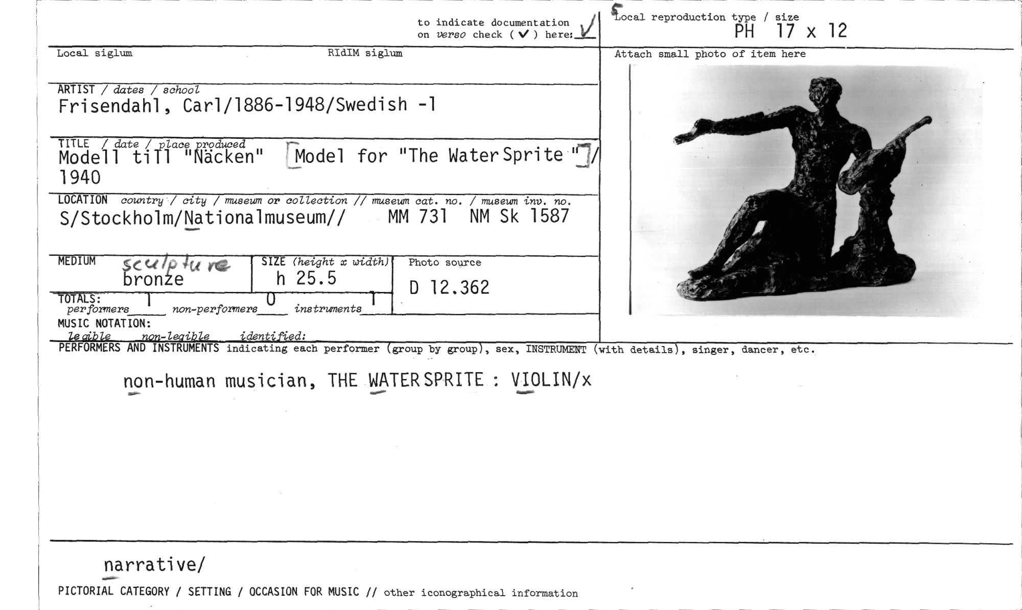//// to indicate documentation //// 1ocal reproduction type / size //// on verso check (V ) here:11 PH 17 x 12 //// Local siglum RIdIM siglum //// Attach small photo of item here //// ARTIST / dates / school //// Frisendahl, Carl/1886-1948/Swedish -1 //// TITLE / date /piace roduced //// Modell till "Näcken" 'Mode] for "The WaterSprite' 1940 //// LOCATION country / city / museum or collection // museum cat. no. / museum inv. no. //// S/Stockholm/Nationalmuseum// MM 731 NM Sk 1587 //// MEDIUM ( G‘ $/.- 4U - //// bron e //// -TOTALS: 1 //// per formers non-perförmers instruments //// MUSIC NOTATION: //// Zocible non-leaible identitUd: //// PERFORMERS AND INSTRUMENTS indicating each performer (group by group), sex, INSTRUMENT //// (with details), singer, dancer, etc. //// SIZE (height x width) //// h 25.5 //// Photo source //// D 12.362 //// non-human musician, THE WATERSPRITE : VIOLIN/x //// narrative/ //// PICTORIAL CATEGORY / SETTING OCCASION FOR MUSIC // other iconographical information ////