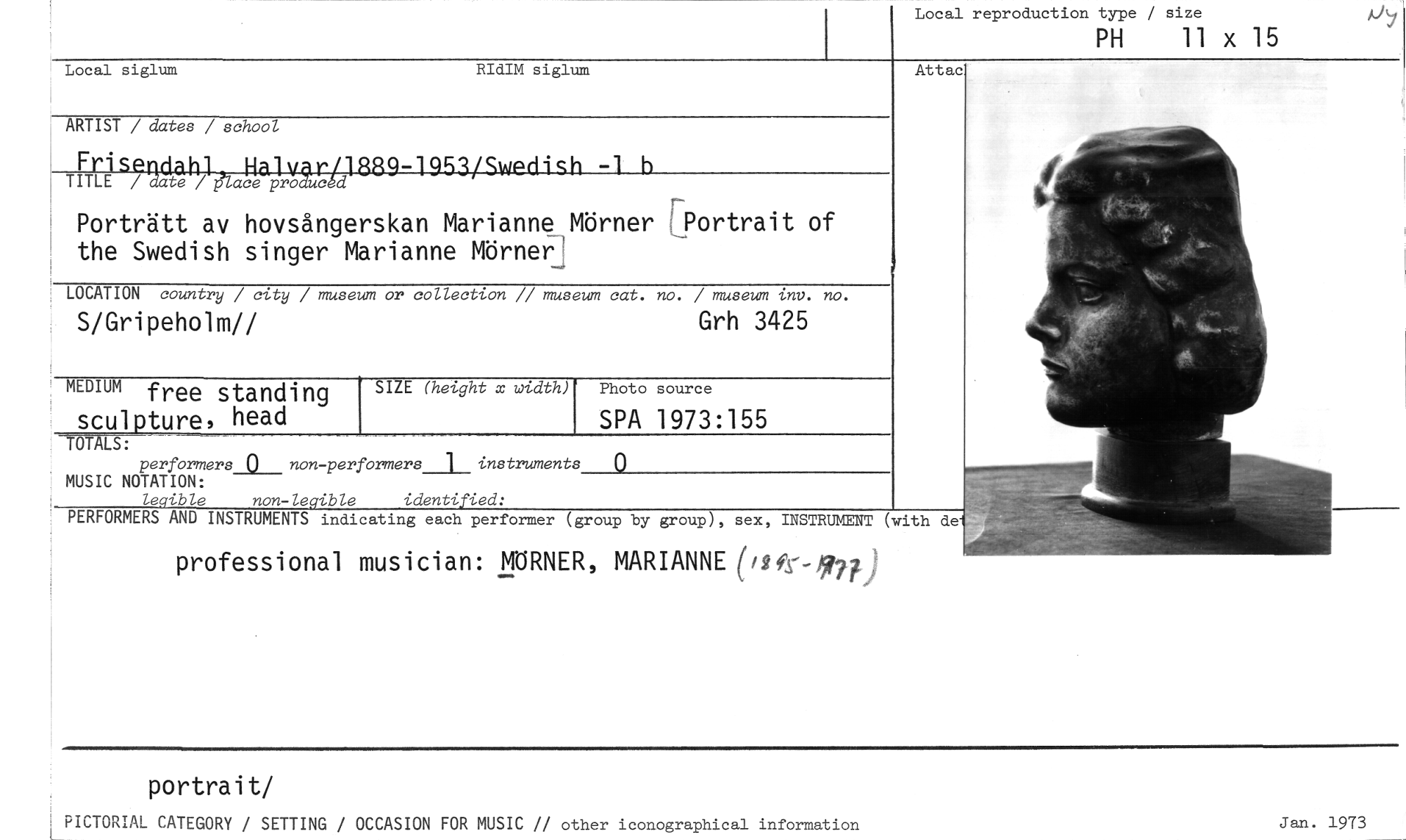 //// Local reproduction type / size //// portrait/ //// PICTORIAL CATEGORY / SETTING / OCCASION FOR MUSIC // other iconographical information Jan. 1973 //// PH 11 x 15 //// Local siglum RIdIM siglum //// ARTIST / dates / school //// Frispyla hl Halvar/1889-193/Swedish -1 b //// TITLE / date / place producåd //// Porträtt av hovsångerskan Marianne Mörner [Portrait of the Swedish singer Marianne Mörner! //// LOCATION country / city / museum or collection // museum cat. no. / museum inv. no. //// S/Gripeholm// Grh 3425 //// Attac //// MEDIUM free standing scul ture, head //// SIZE (height x width) //// Photo source //// SPA 1973:155 //// TOT LS: //// performers 0 non-performers_l_ instruments 0 //// MUSIC NOTATION: //// legible non-legible identified: //// PERFORMERS AND INSTRUMENTS indicating each performer (group by //// group), sex, INSTRUMENT (with de //// professional musician: MÖRNER, MARIANNE (/9e-977 ////