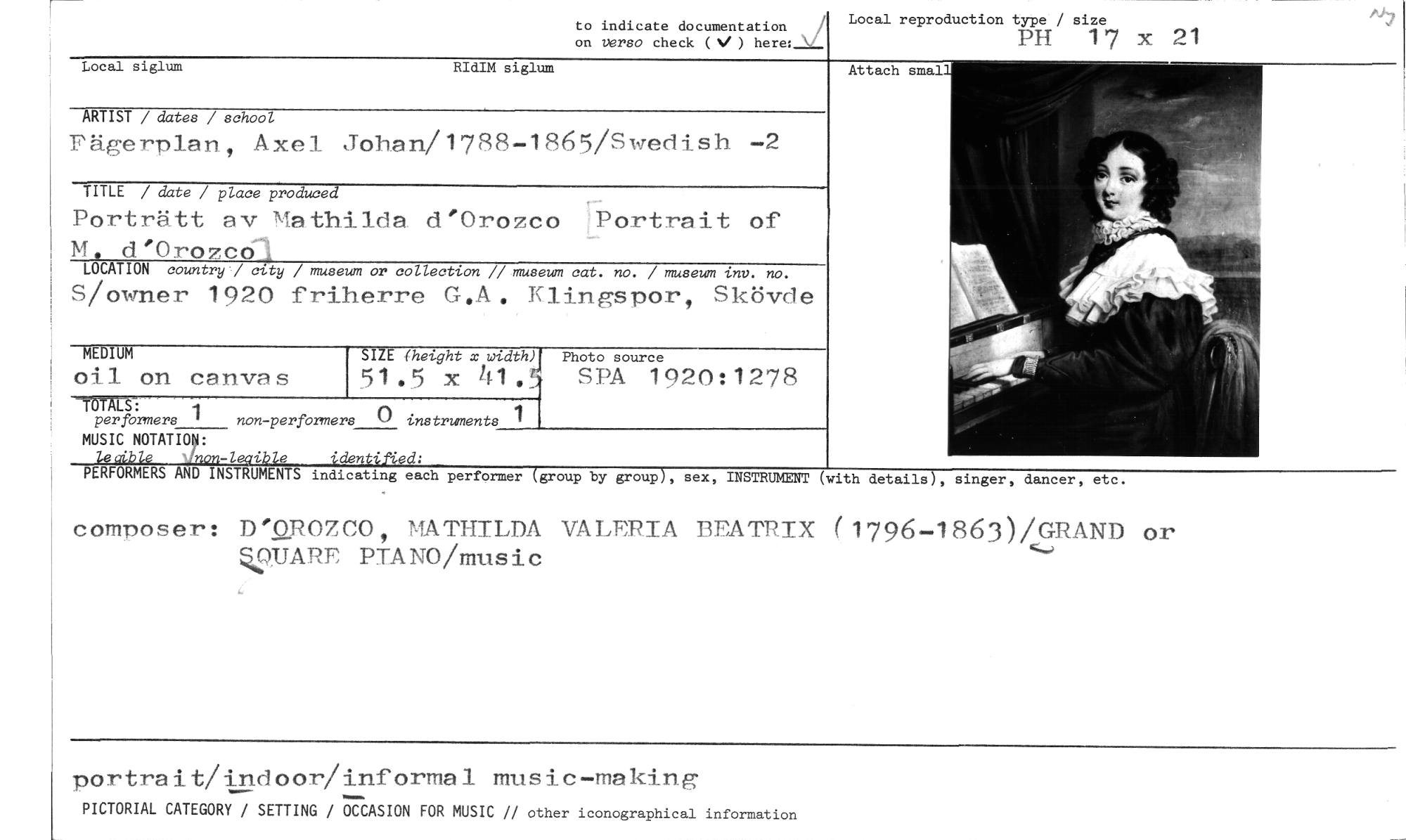 //// to indicate documentation //// on versa check (V ) heresi //// Local reproduction type / size //// PH 17 x 21 //// Local siglum RIdIM siglum //// ARTIST / dater / school //// Fägerplan, Axel Johan/1738-1865/Swedish -2 //// TITLE / date / place produced //// Porträtt av Mathilda, d'Orozco Portrait of M. d'Orozco) //// LOCATION country" city / museum or collection // museum cat. no. / museum inv. no. //// S/owner 1920 friherre G.A. Klingspor, Skövde //// MEDIUM //// oil on canvas //// -=:". //// per formers ' non-performers () instruments 1 //// SIZE aeight x widthi Photo source //// MUSIC NOTATION: //// leaible identified: //// PERFORMERS AND INSTRUMENTS indicating each performer (group by group), sex, //// composer: D'QROZCO, MATHILDA VALERIA BEATRIX (1796-1863/GRAND k9UARE PTANO/music 51.5 X 41„ SFA 1920:1278 //// or //// portrait/indoor/informal music-making //// PICTORIAL CATEGORY / SETTING / OCCASION FOR MUSIC // other iconographical information //// Attach smal //// INSTRUMENT (with details), singer, dancer, etc. ////