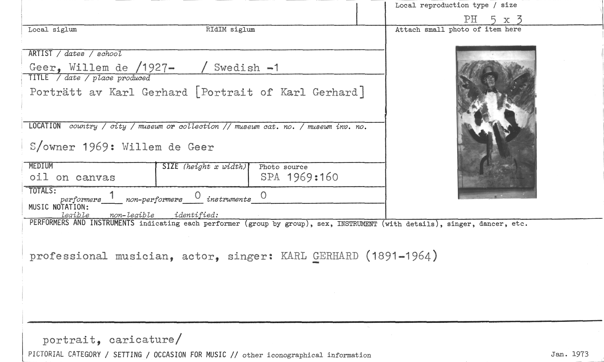 //// Local reproduct on type / size //// PH 5 x 3 //// Attach small photo of item here //// Local siglum RIdIM siglum //// ARTIST / dates / school //// Geer, Willem de /1927— / Swedish —1 //// TITLE / date / place produced //// Porträtt av Karl Gerhard [Portrait of Karl Gerhard] //// LOCATION country / city / museum or collection // museum cat. no. / museum inv. no. //// S/owner 1969: Willem de Geer //// Photo source //// SPA 1969:160 //// T LS: //// performers 1 non-performers MUSIC NOTATION: //// legible non -legible identified: //// MEDIUM //// oil on canvas //// SIZE (height x width) //// ° instruments //// PERFORMERS AND INSTRUMENTS indicating each performer (group by group), sex, INSTRUMENT (with details), singer, dancer, etc. //// professional musician, actor, singer: KARL GERHARD (1891-1964) //// portrait, caricature/ //// PICTORIAL CATEGORY / SETTING / OCCASION FOR MUSIC // other iconographical information //// Jan. 1973 ////
